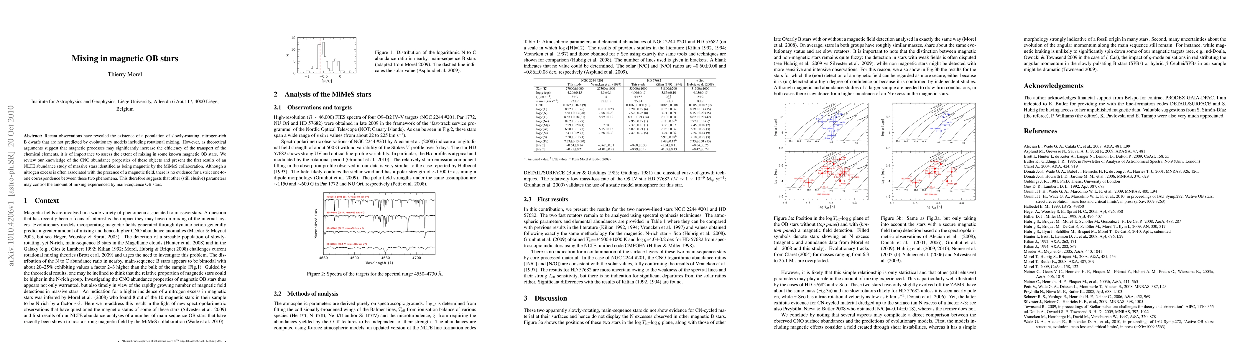 This paper reviews the mixing processes in magnetic OB stars, highlighting that while magnetic fields may enhance element transport, the nitrogen excess in these stars does not strictly correlate with magnetism, indicating other factors likely influence mixing. Initial NLTE abundance studies from the MiMeS collaboration reveal complex mixing dynamics in these massive stars.