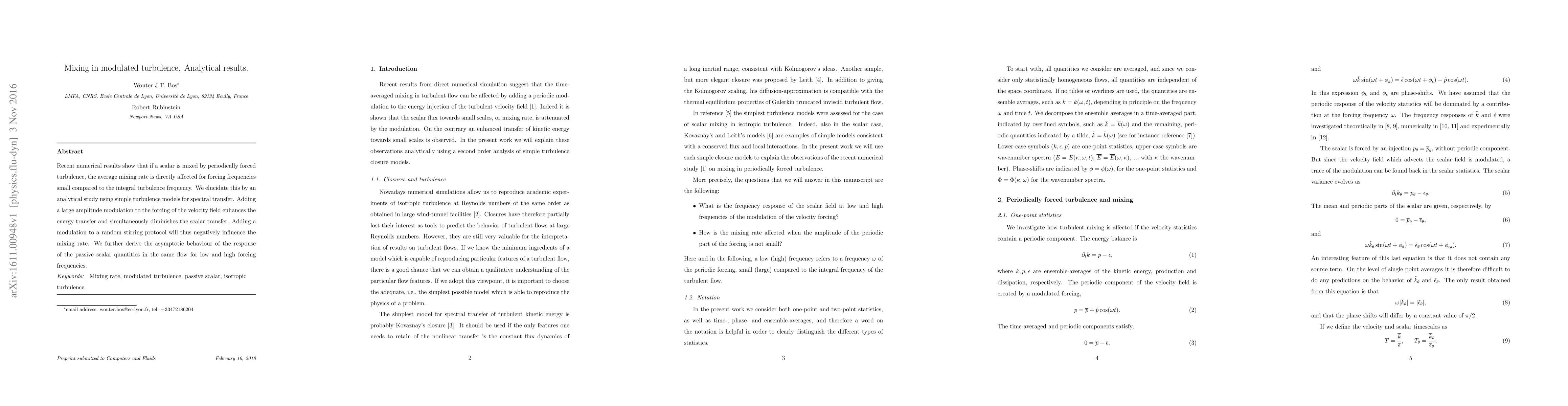 Recent numerical results show that if a scalar is mixed by periodically forced turbulence, the average mixing rate is directly affected for forcing frequencies small compared to the integral turbulence frequency. We elucidate this by an analytical study using simple turbulence models for spectral transfer. Adding a large amplitude modulation to the forcing of the velocity field enhances the energy transfer and simultaneously diminishes the scalar transfer. Adding a modulation to a random stirring protocol will thus negatively influence the mixing rate. We further derive the asymptotic behaviour of the response of the passive scalar quantities in the same flow for low and high forcing frequencies.