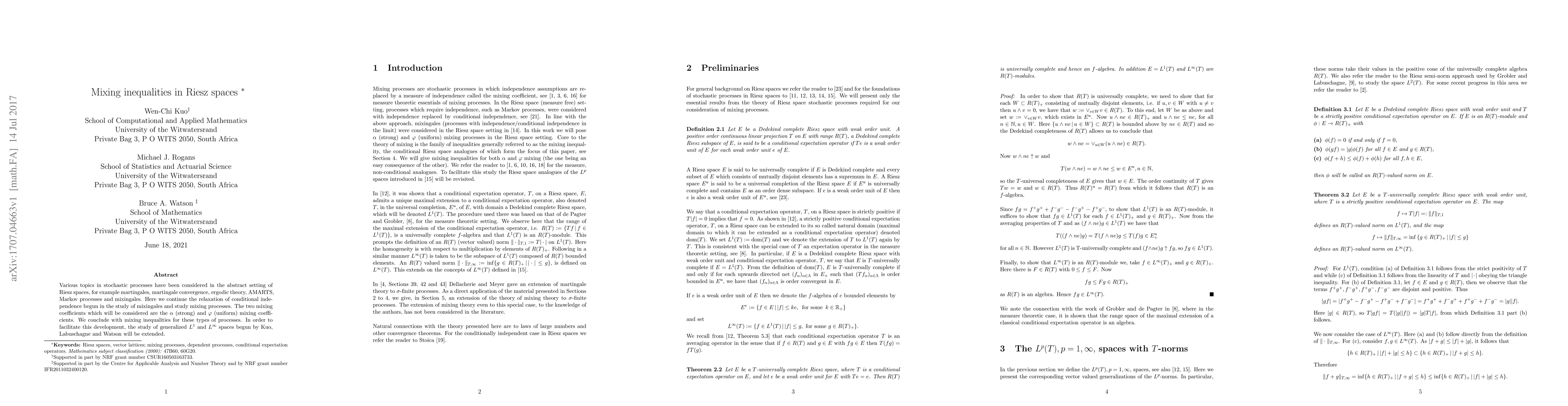 This paper explores the mixing properties of stochastic processes within the framework of Riesz spaces, focusing on $\alpha$ and $\varphi$ mixing coefficients. It extends the study of generalized $L^1$ and $L^\infty$ spaces to derive mixing inequalities for these processes.