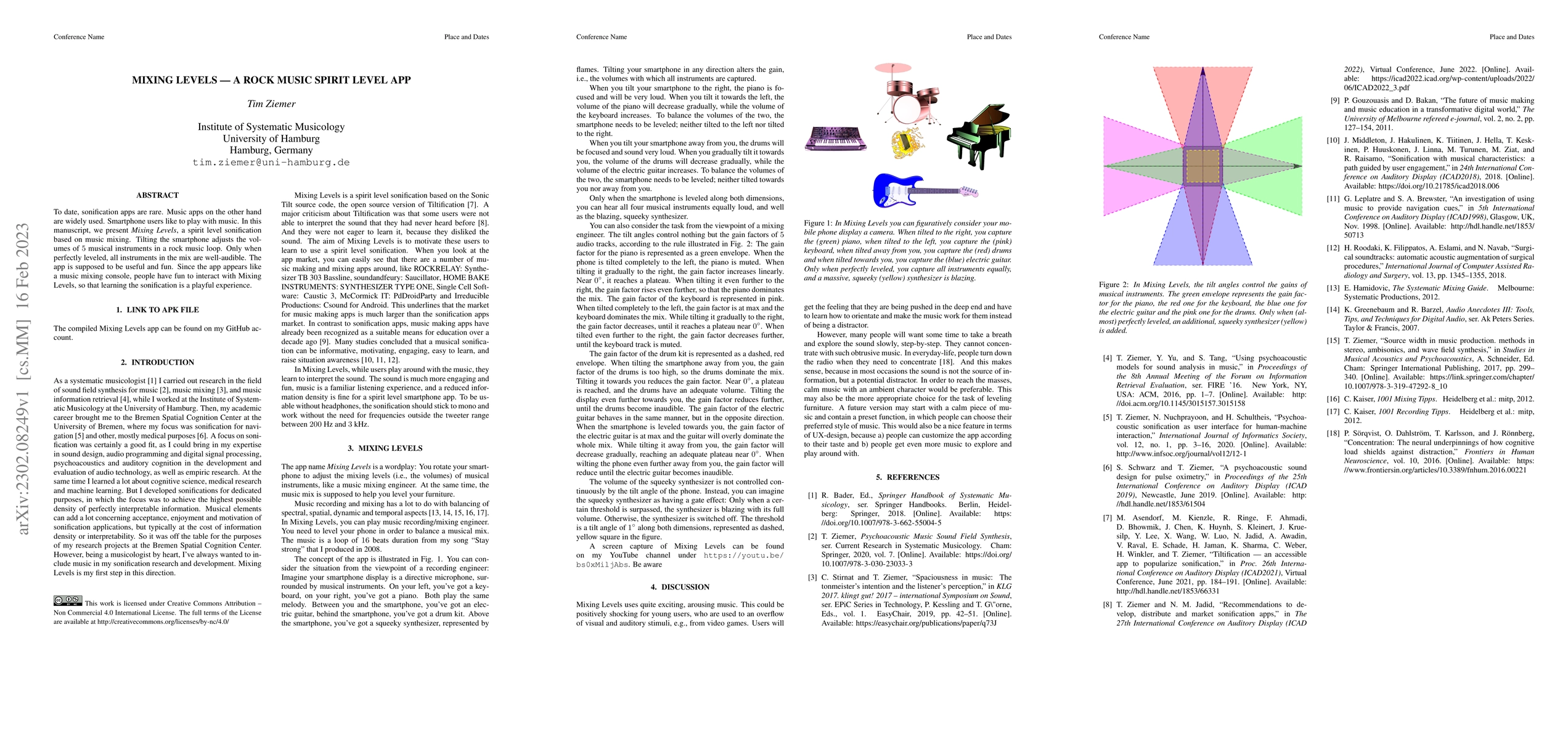 Mixing Levels is a smartphone app that uses music mixing to create a spirit level sonification. By tilting the device, users adjust the volume of five rock instruments, achieving a balanced mix when perfectly leveled, providing both a fun and educational experience.