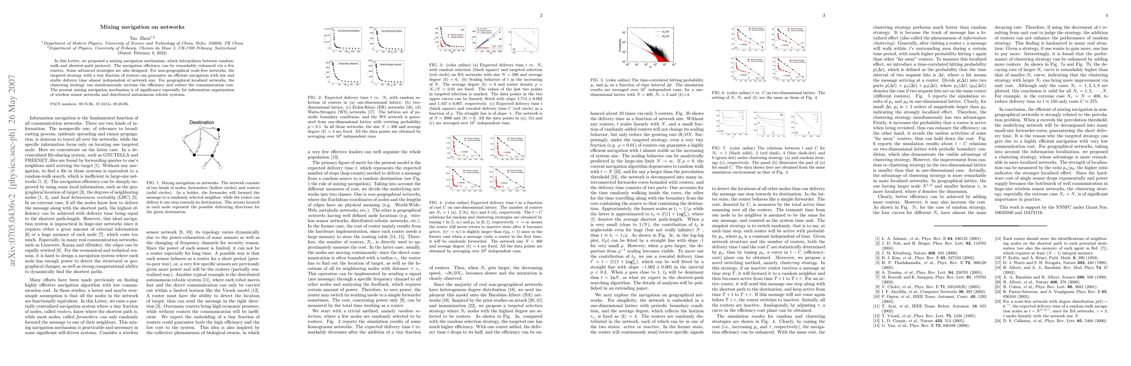 In this Letter, we proposed a mixing navigation mechanism, which interpolates between random-walk and shortest-path protocol. The navigation efficiency can be remarkably enhanced via a few routers. Some advanced strategies are also designed: For non-geographical scale-free networks, the targeted strategy with a tiny fraction of routers can guarantee an efficient navigation with low and stable delivery time almost independent of network size. For geographical localized networks, the clustering strategy can simultaneously increase the efficiency and reduce the communication cost. The present mixing navigation mechanism is of significance especially for information organization of wireless sensor networks and distributed autonomous robotic systems.