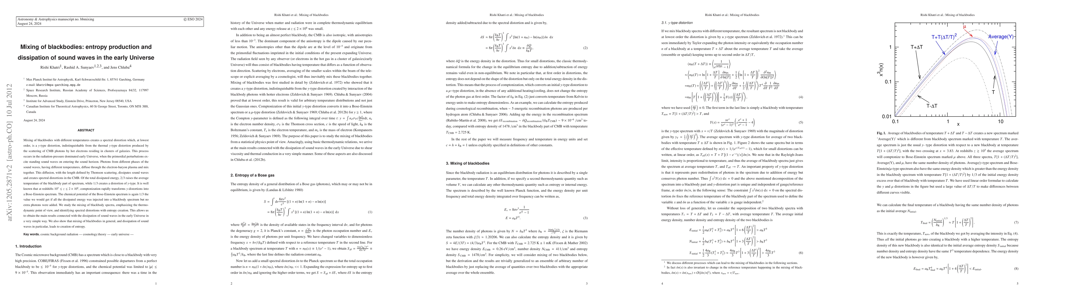 Research shows that mixing of blackbodies in the early Universe creates sound wave spectral distortions through entropy production, with 2/3 energy raising average temperature and 1/3 creating y-type distortion.