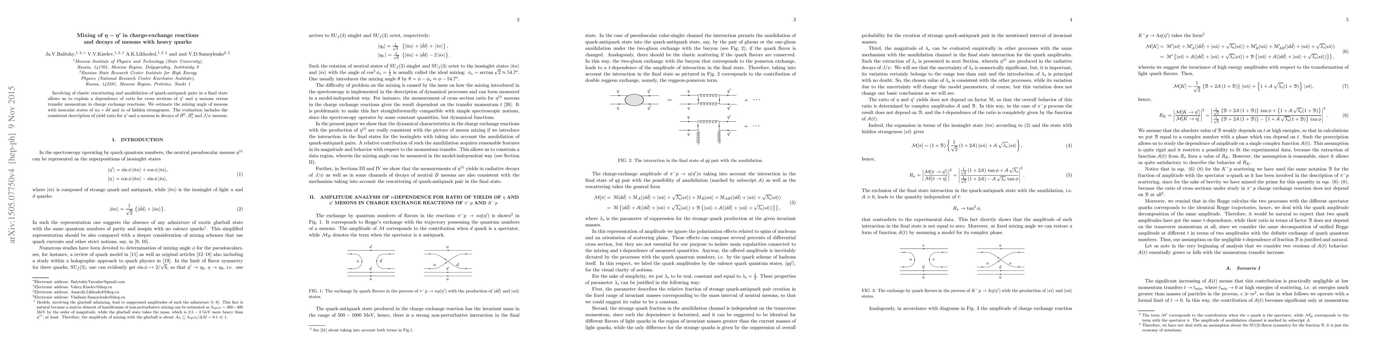This paper explores the mixing of $\eta$ and $\eta'$ mesons in charge-exchange reactions and decays involving heavy quarks, attributing observed cross-section ratios to final-state rescattering and annihilation effects. The study estimates the mixing angle between $\eta$ and isoscalar states, providing a consistent description of the yield ratio in decays of $B^0$, $B^0_s$, and $J/\psi$ mesons.