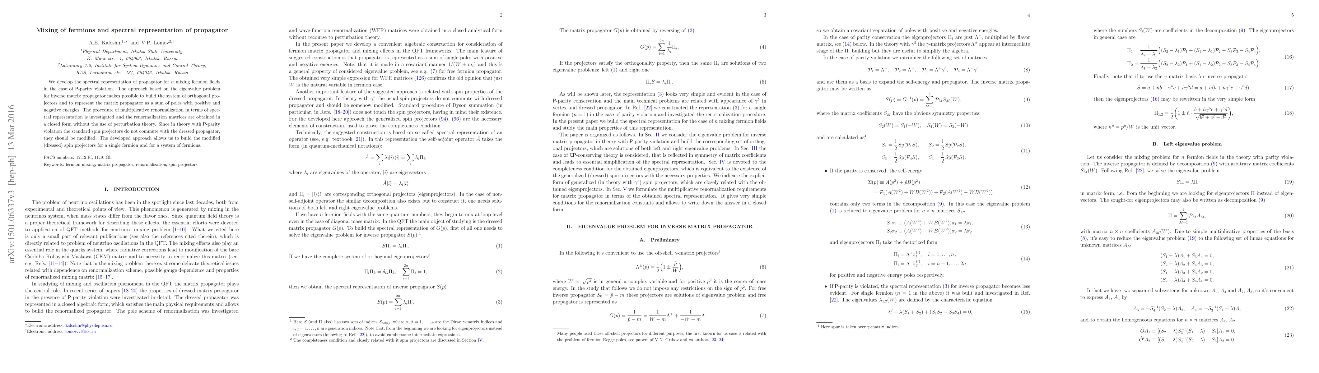 We develop the spectral representation of propagator for $n$ mixing fermion fields in the case of $\mathsf{P}$-parity violation. The approach based on the eigenvalue problem for inverse matrix propagator makes possible to build the system of orthogonal projectors and to represent the matrix propagator as a sum of poles with positive and negative energies. The procedure of multiplicative renormalization in terms of spectral representation is investigated and the renormalization matrices are obtained in a closed form without the use of perturbation theory. Since in theory with $\mathsf{P}$-parity violation the standard spin projectors do not commute with the dressed propagator, they should be modified. The developed approach allows us to build the modified (dressed) spin projectors for a single fermion and for a system of fermions.