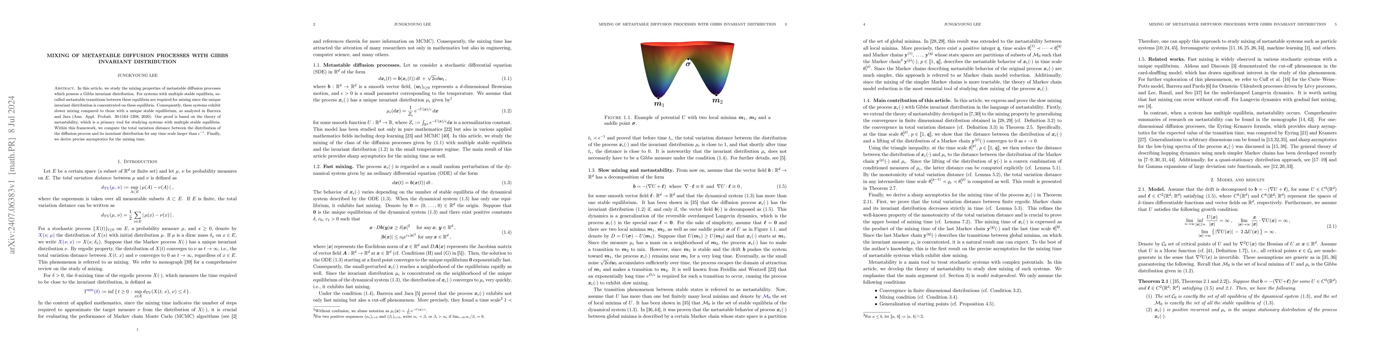 This paper investigates the mixing properties of metastable diffusion processes with a Gibbs invariant distribution, revealing slower mixing due to transitions between multiple stable equilibria. The authors utilize metastability theory to compute the total variation distance and derive precise asymptotics for the mixing time.