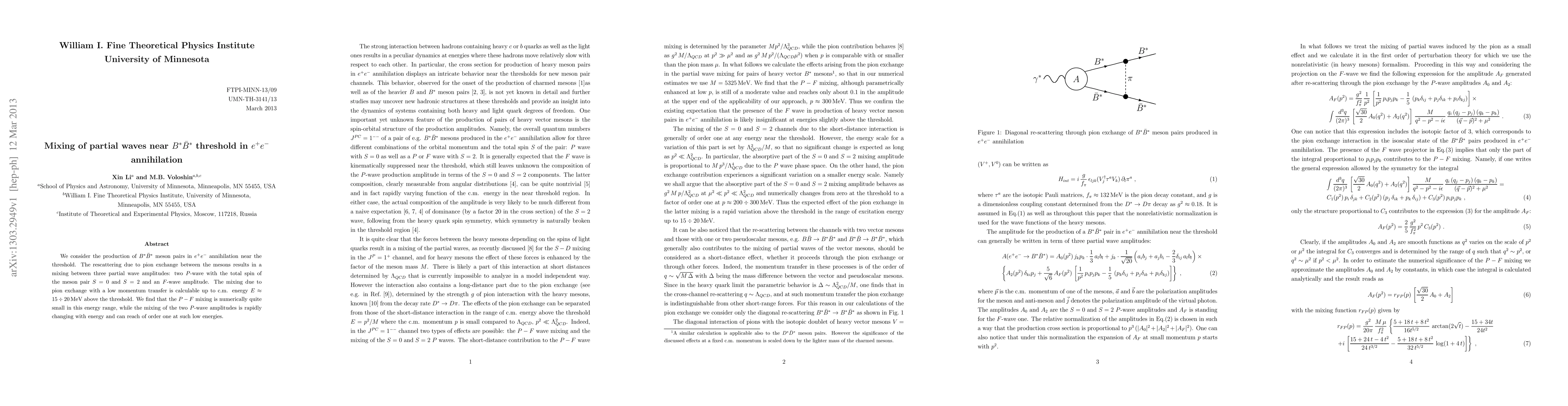 We consider the production of $B^* \bar B^*$ meson pairs in $e^+e^-$ annihilation near the threshold. The rescattering due to pion exchange between the mesons results in a mixing between three partial wave amplitudes: two $P$-wave with the total spin of the meson pair S=0 and S=2 and an F-wave amplitude. The mixing due to pion exchange with a low momentum transfer is calculable up to c.m. energy $E \approx 15 \div 20$\,MeV above the threshold. We find that the $P-F$ mixing is numerically quite small in this energy range, while the mixing of the two P-wave amplitudes is rapidly changing with energy and can reach of order one at such low energies.