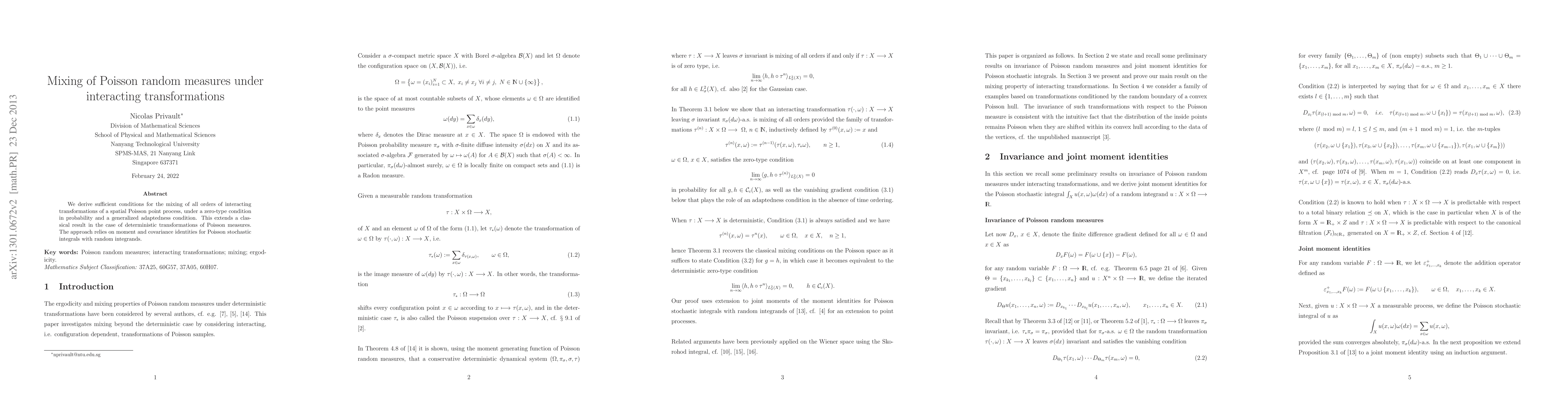We derive sufficient conditions for the mixing of all orders of interacting transformations of a spatial Poisson point process, under a zero-type condition in probability and a generalized adaptedness condition. This extends a classical result in the case of deterministic transformations of Poisson measures. The approach relies on moment and covariance identities for Poisson stochastic integrals with random integrands.