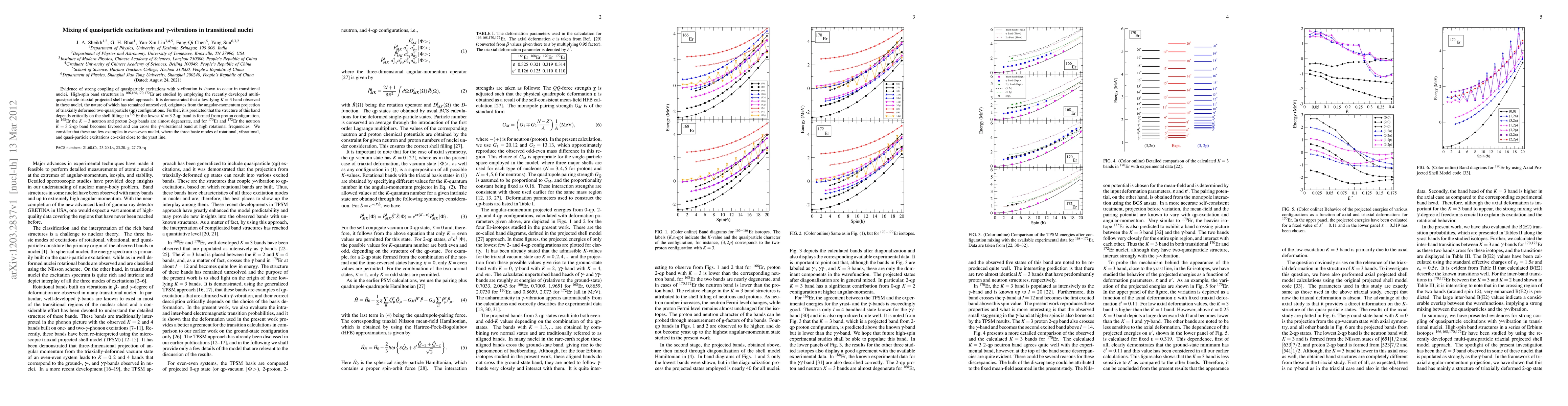 The study reveals strong coupling of quasiparticle excitations with gamma-vibrations in transitional nuclei using the multi-quasiparticle triaxial projected shell model. It explains the origin of low-lying K=3 bands in Er isotopes and predicts their behavior based on shell filling, suggesting co-existence of rotational, vibrational, and quasi-particle excitations near the yrast line in even-even nuclei.