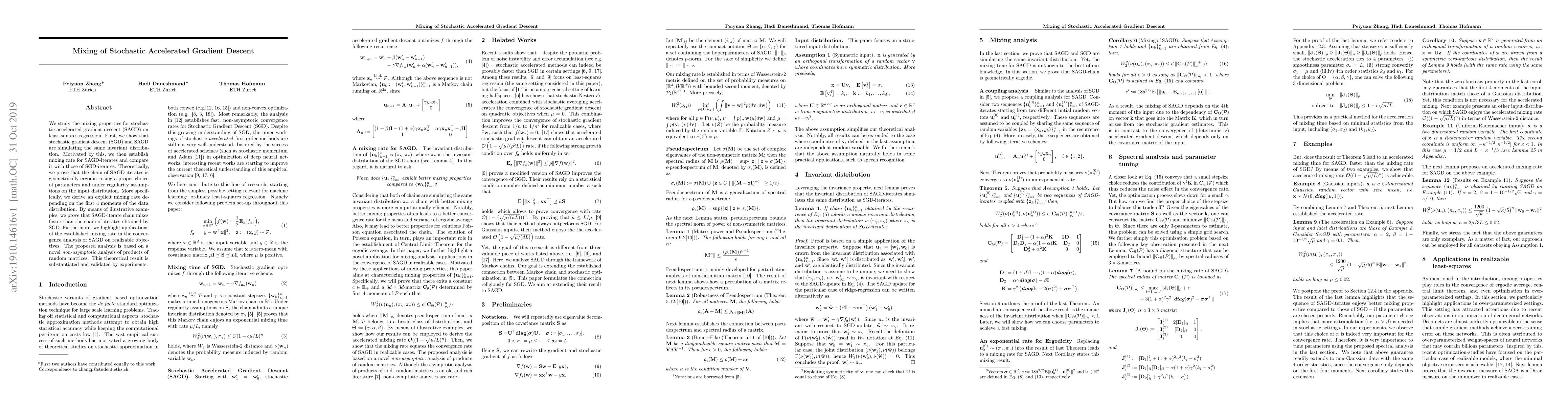 This paper investigates the mixing properties of stochastic accelerated gradient descent (SAGD) for least-squares regression, proving that SAGD and SGD simulate the same invariant distribution. It establishes a geometrically ergodic mixing rate for SAGD, showing faster convergence compared to SGD, and applies this analysis to the convergence of SAGD on realizable objectives.
