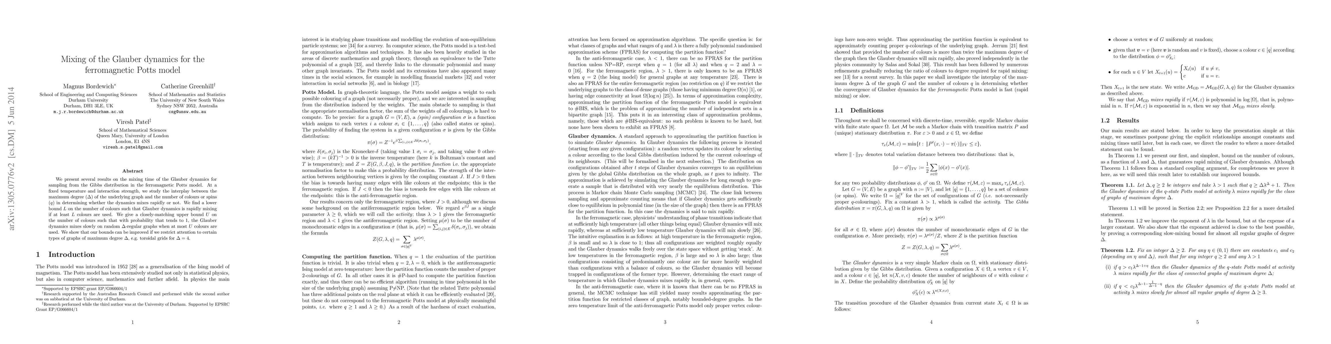 This paper investigates the mixing time of the Glauber dynamics for the ferromagnetic Potts model, focusing on how the maximum degree of the graph and the number of colours influence mixing speed. It establishes lower and upper bounds for the number of colours needed for rapid mixing, and shows improvements for specific graph types like toroidal grids.