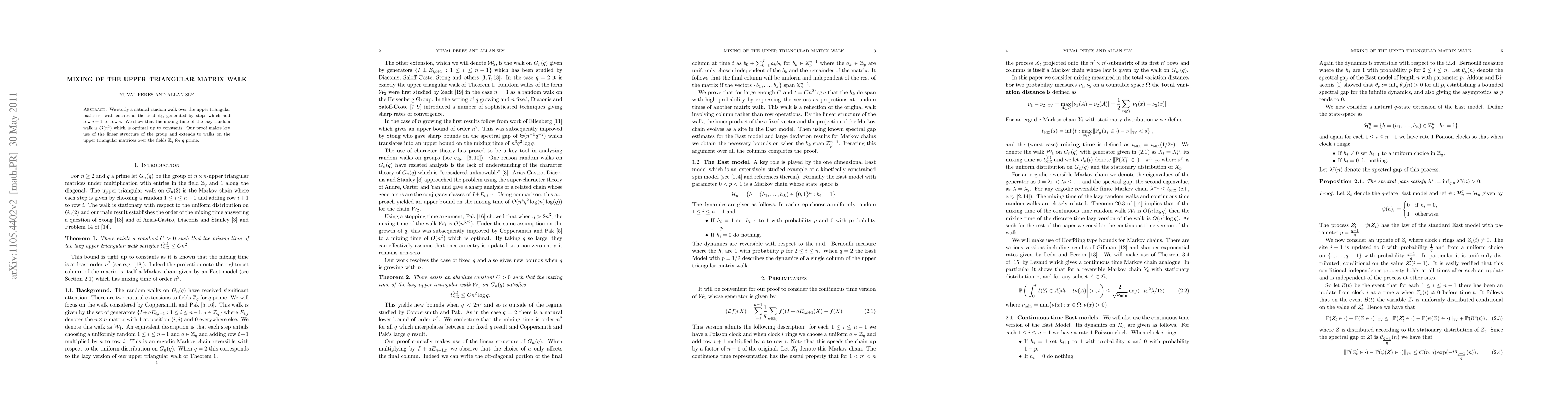 The study of a random walk over upper triangular matrices shows that the mixing time for a lazy random walk is O(n^2) with optimal up to constants.