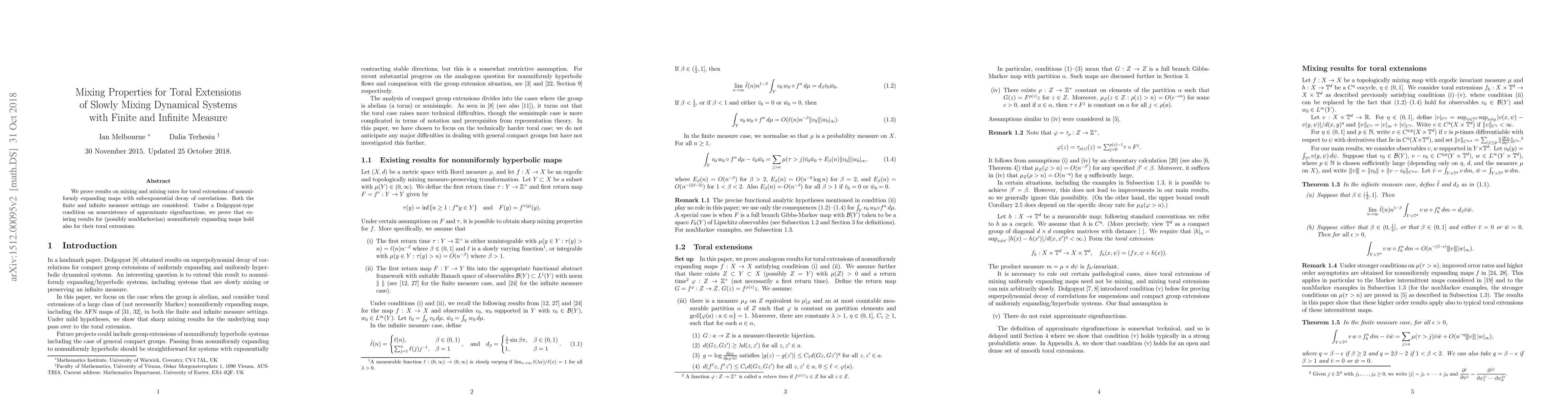 This paper proves mixing properties and rates for toral extensions of nonuniformly expanding maps with subexponential decay, applicable in both finite and infinite measure settings. It demonstrates that established results for such maps extend to their toral extensions under a Dolgopyat-type condition.