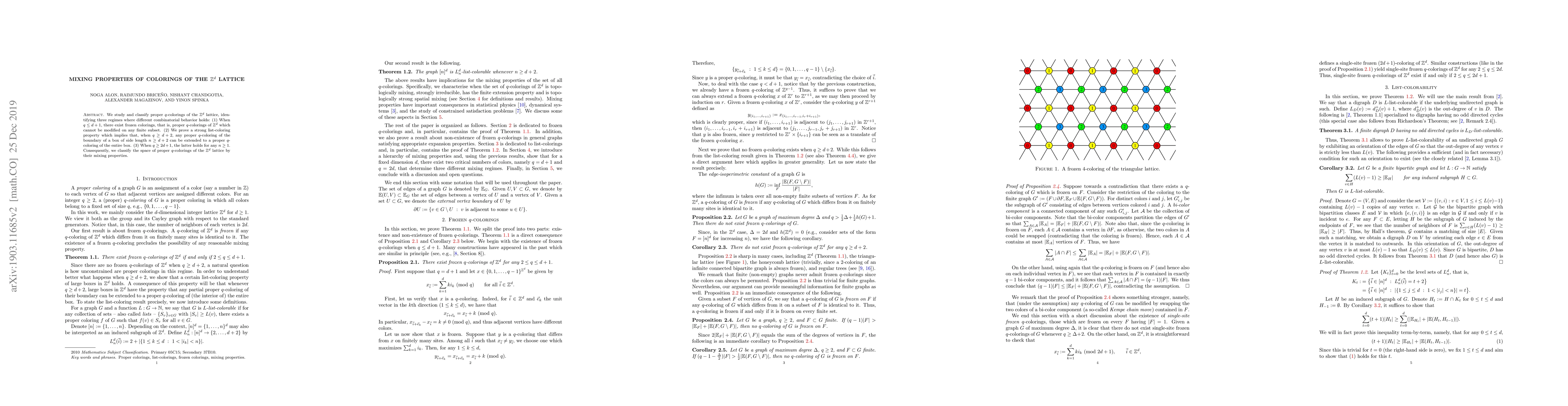 We study and classify proper $q$-colorings of the $\mathbb Z^d$ lattice, identifying three regimes where different combinatorial behavior holds: (1) When $q\le d+1$, there exist frozen colorings, that is, proper $q$-colorings of $\mathbb Z^d$ which cannot be modified on any finite subset. (2) We prove a strong list-coloring property which implies that, when $q\ge d+2$, any proper $q$-coloring of the boundary of a box of side length $n \ge d+2$ can be extended to a proper $q$-coloring of the entire box. (3) When $q\geq 2d+1$, the latter holds for any $n \ge 1$. Consequently, we classify the space of proper $q$-colorings of the $\mathbb Z^d$ lattice by their mixing properties.