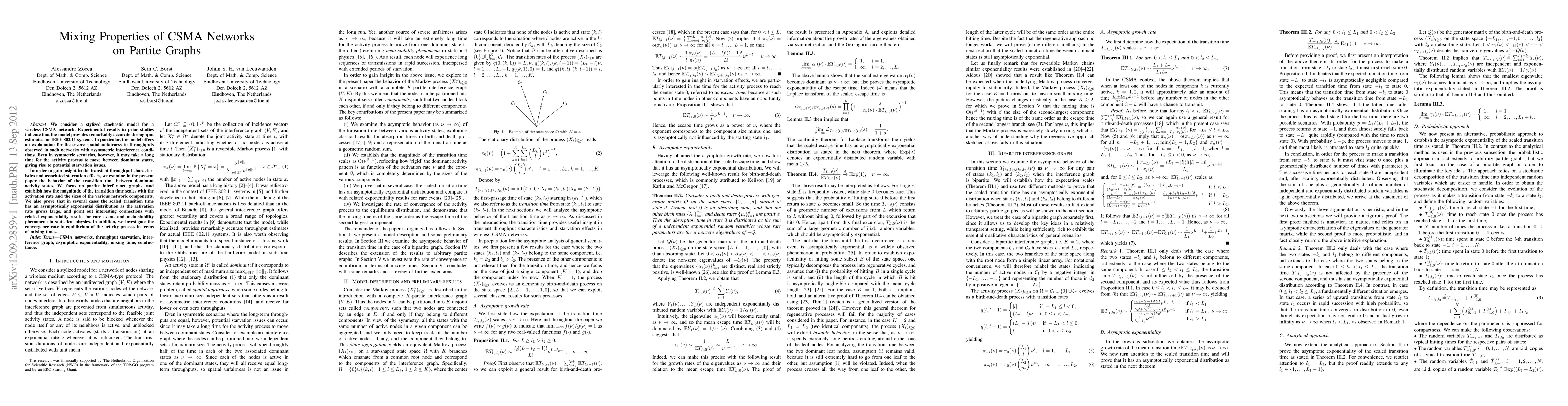 We consider a stylized stochastic model for a wireless CSMA network. Experimental results in prior studies indicate that the model provides remarkably accurate throughput estimates for IEEE 802.11 systems. In particular, the model offers an explanation for the severe spatial unfairness in throughputs observed in such networks with asymmetric interference conditions. Even in symmetric scenarios, however, it may take a long time for the activity process to move between dominant states, giving rise to potential starvation issues. In order to gain insight in the transient throughput characteristics and associated starvation effects, we examine in the present paper the behavior of the transition time between dominant activity states. We focus on partite interference graphs, and establish how the magnitude of the transition time scales with the activation rate and the sizes of the various network components. We also prove that in several cases the scaled transition time has an asymptotically exponential distribution as the activation rate grows large, and point out interesting connections with related exponentiality results for rare events and meta-stability phenomena in statistical physics. In addition, we investigate the convergence rate to equilibrium of the activity process in terms of mixing times.