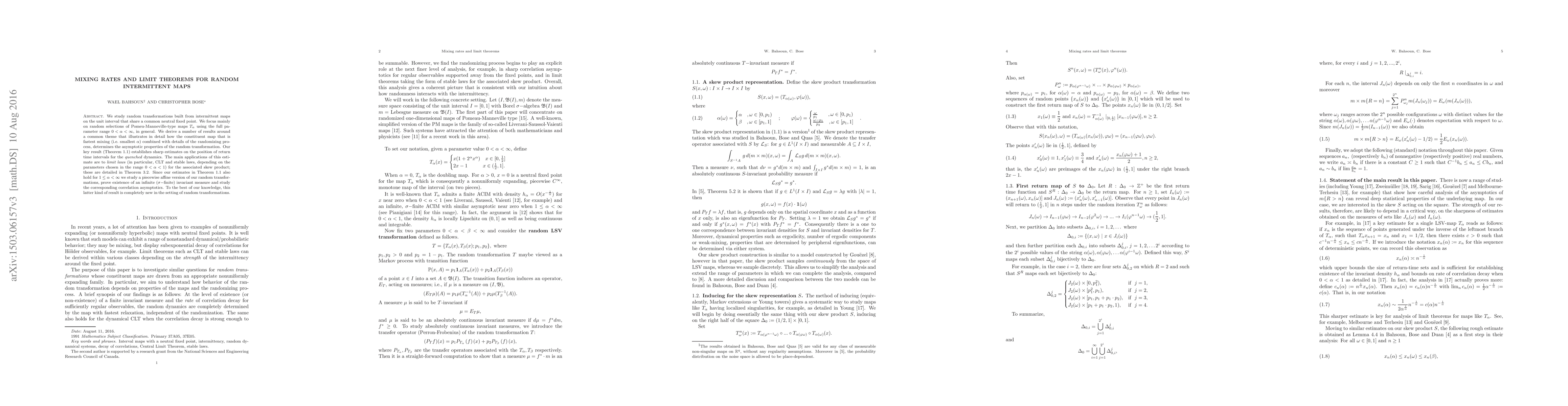 We study random transformations built from intermittent maps on the unit interval that share a common neutral fixed point. We focus mainly on random selections of Pomeu-Manneville-type maps $T_\alpha$ using the full parameter range $0< \alpha < \infty$, in general. We derive a number of results around a common theme that illustrates in detail how the constituent map that is fastest mixing (i.e.\ smallest $\alpha$) combined with details of the randomizing process, determines the asymptotic properties of the random transformation. Our key result (Theorem 1.1) establishes sharp estimates on the position of return time intervals for the \emph{quenched} dynamics. The main applications of this estimate are to \textit{limit laws} (in particular, CLT and stable laws, depending on the parameters chosen in the range $0 < \alpha < 1$) for the associated skew product; these are detailed in Theorem 3.2. Since our estimates in Theorem 1.1 also hold for $1 \leq \alpha < \infty$ we study a piecewise affine version of our random transformations, prove existence of an infinite ($\sigma-$finite) invariant measure and study the corresponding correlation asymptotics. To the best of our knowledge, this latter kind of result is completely new in the setting of random transformations.