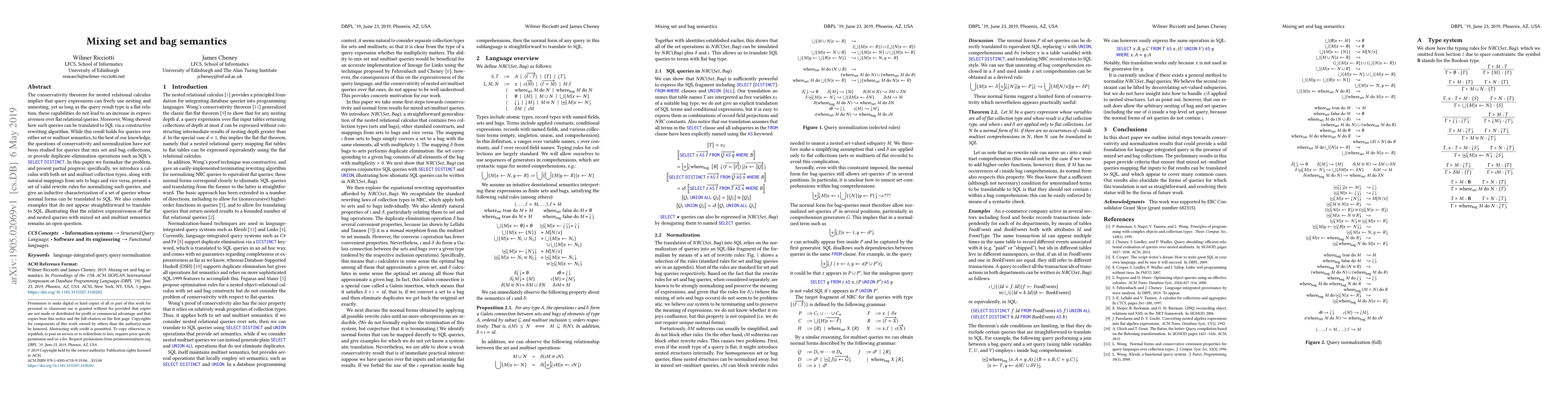 This paper formalizes the conservativity theorem for nested relational calculus when mixing set and bag semantics and presents a calculus that incorporates both set and multiset types. It introduces valid rewrite rules for normalizing mixed queries and discusses the open question of their translation to SQL.