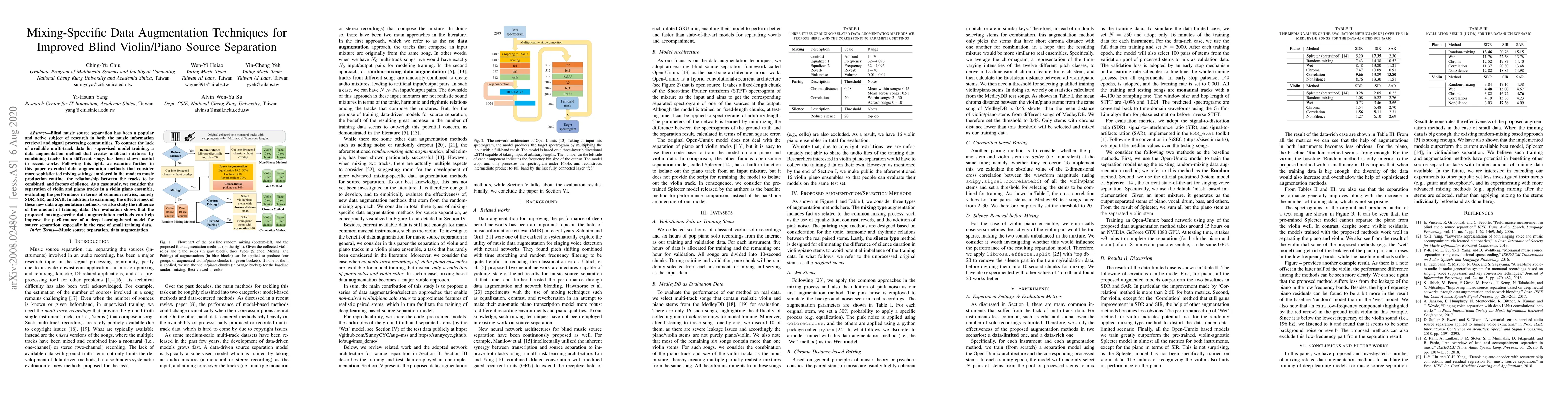 This paper explores advanced data augmentation techniques for enhancing blind violin/piano source separation, addressing the scarcity of multi-track training data. The proposed methods consider modern mixing settings and track relationships, leading to improved performance in separation metrics, especially with limited training data.
