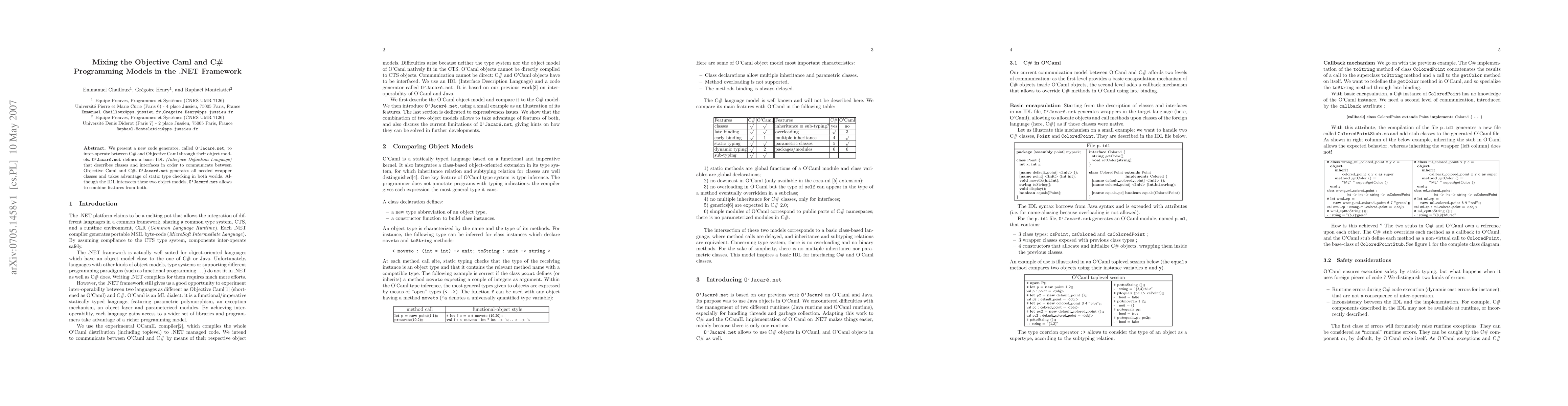 **Summary:** O'Jacare.net is a code generator facilitating interoperability between C# and Objective Caml by generating necessary wrapper classes and leveraging static type checking in both languages, enabling integration of features from both programming models.