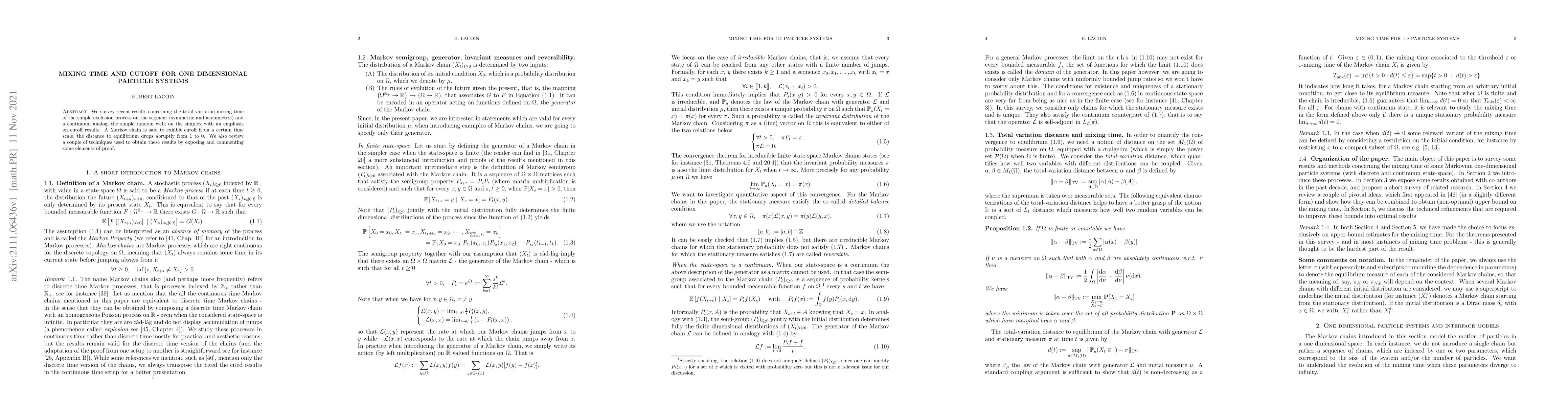 This paper surveys recent findings on the mixing time and cutoff phenomena in one-dimensional particle systems, focusing on the simple exclusion process and its continuum analog, the simple random walk on the simplex. It highlights techniques used to demonstrate cutoff, where the system rapidly transitions from far to near equilibrium.