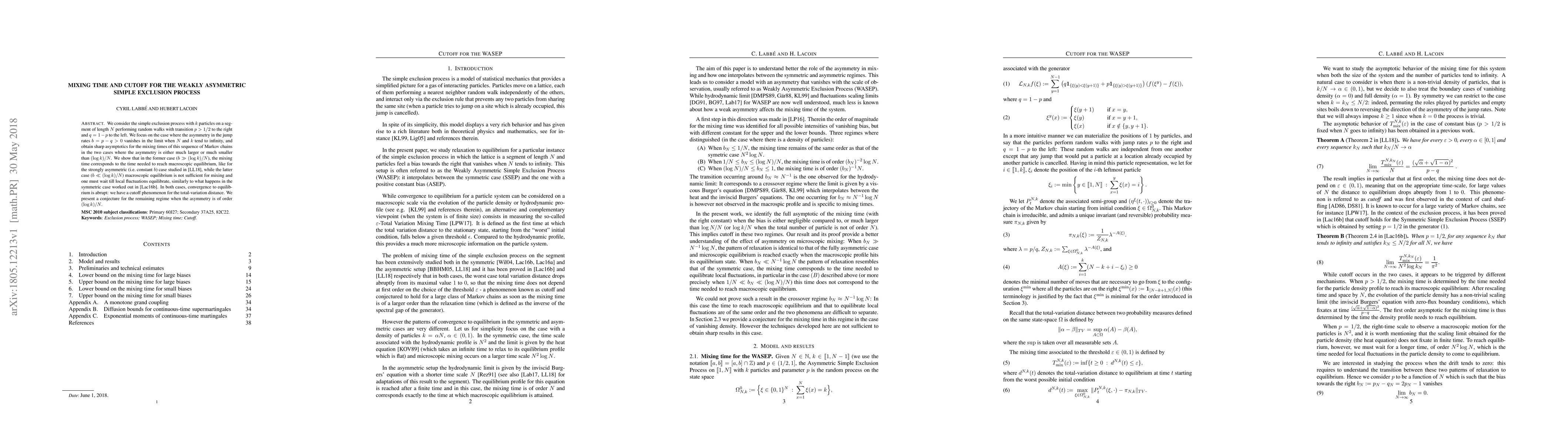 This paper studies the mixing time and cutoff phenomenon in the weakly asymmetric simple exclusion process, where particles have a slight preference for moving in one direction. It finds that the mixing time depends on the relative size of the asymmetry compared to $(\log k)/N$, showing a cutoff phenomenon in both large and small asymmetry cases.