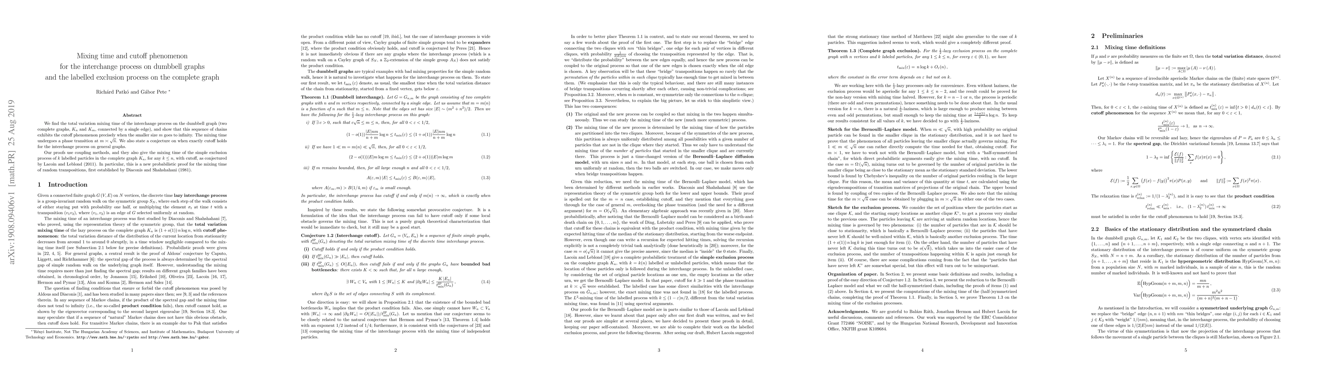 This paper investigates the mixing time and cutoff phenomenon for the interchange process on dumbbell graphs and the labelled exclusion process on complete graphs. It finds that the mixing time exhibits a phase transition at $m \asymp \sqrt{n}$ and conjectures cutoff conditions for general graphs. The proofs utilize coupling methods and provide a new probabilistic proof for the mixing time of random transpositions.