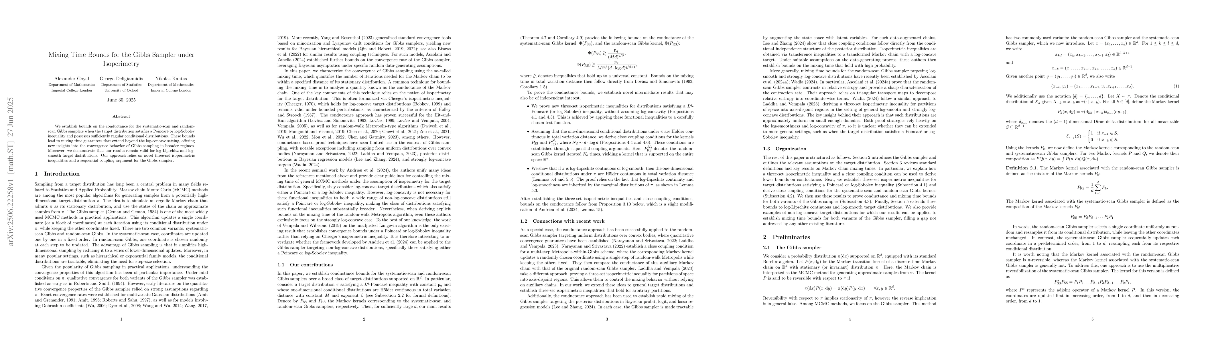 We establish bounds on the conductance for the systematic-scan and random-scan Gibbs samplers when the target distribution satisfies a Poincare or log-Sobolev inequality and possesses sufficiently regular conditional distributions. These bounds lead to mixing time guarantees that extend beyond the log-concave setting, offering new insights into the convergence behavior of Gibbs sampling in broader regimes. Moreover, we demonstrate that our results remain valid for log-Lipschitz and log-smooth target distributions. Our approach relies on novel three-set isoperimetric inequalities and a sequential coupling argument for the Gibbs sampler.