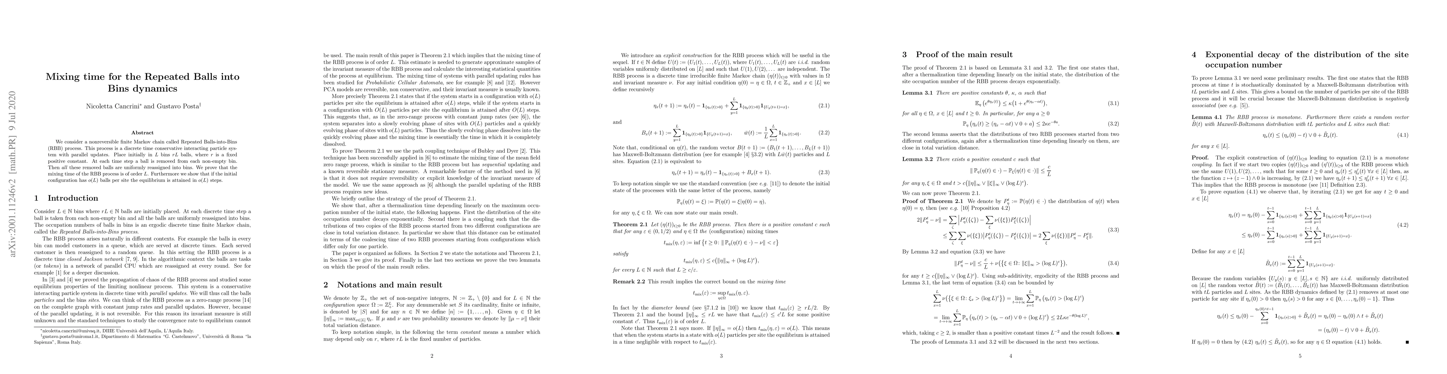 This research estimates the mixing time of the Repeated Balls-into-Bins (RBB) process, a nonreversible Markov chain. It proves that the mixing time depends linearly on the maximum occupation number of balls in the initial state. If the initial configuration has a maximum occupation number of order L, the mixing time is also of the same order. However, for more diluted initial configurations, equilibrium is reached in a time of order (log L)^c.