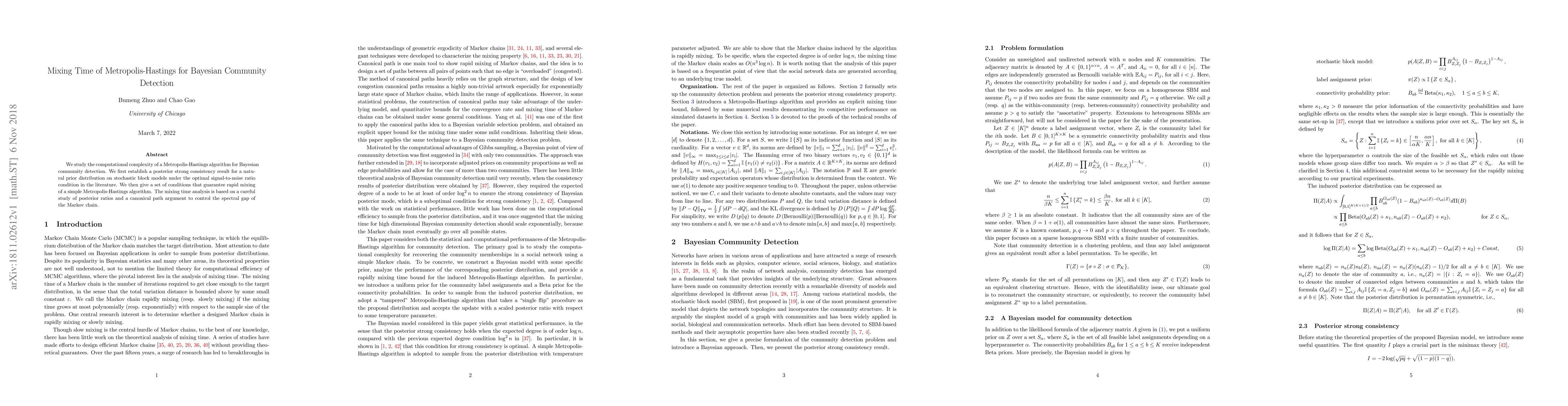 This paper investigates the computational efficiency of a Metropolis-Hastings algorithm for Bayesian community detection, proving posterior strong consistency and establishing conditions for rapid mixing through a detailed analysis of posterior ratios and spectral gap control.