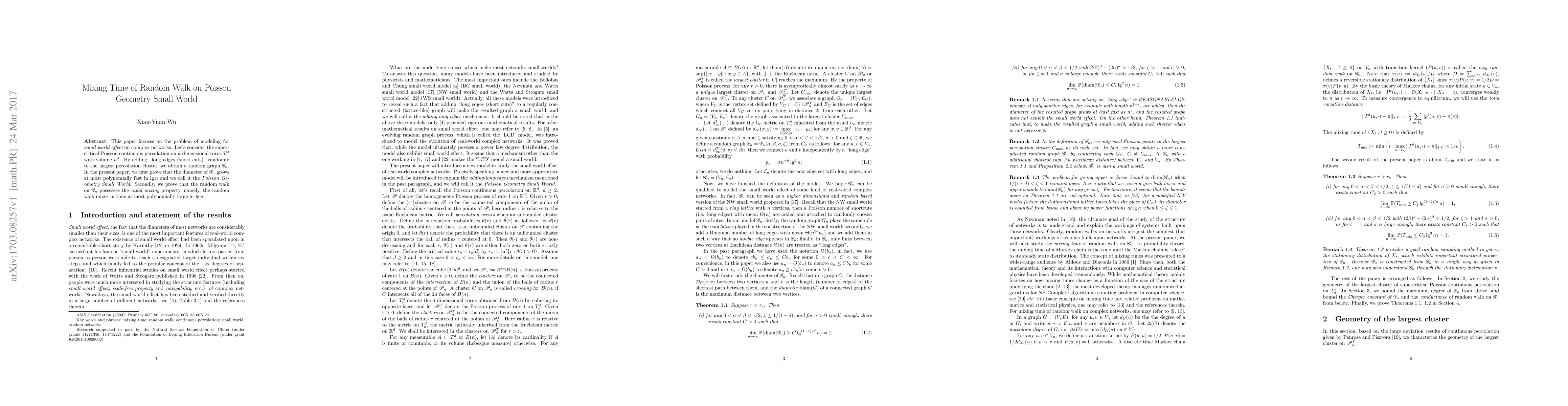 This paper focuses on the problem of modeling for small world effect on complex networks. Let's consider the supercritical Poisson continuous percolation on $d$-dimensional torus $T^d_n$ with volume $n^d$. By adding "long edges (short cuts)" randomly to the largest percolation cluster, we obtain a random graph $\mathscr G_n$. In the present paper, we first prove that the diameter of $\mathscr G_n$ grows at most polynomially fast in $\ln n$ and we call it the Poisson Geometry Small World. Secondly, we prove that the random walk on $\mathscr G_n$ possesses the rapid mixing property, namely, the random walk mixes in time at most polynomially large in $\ln n$.