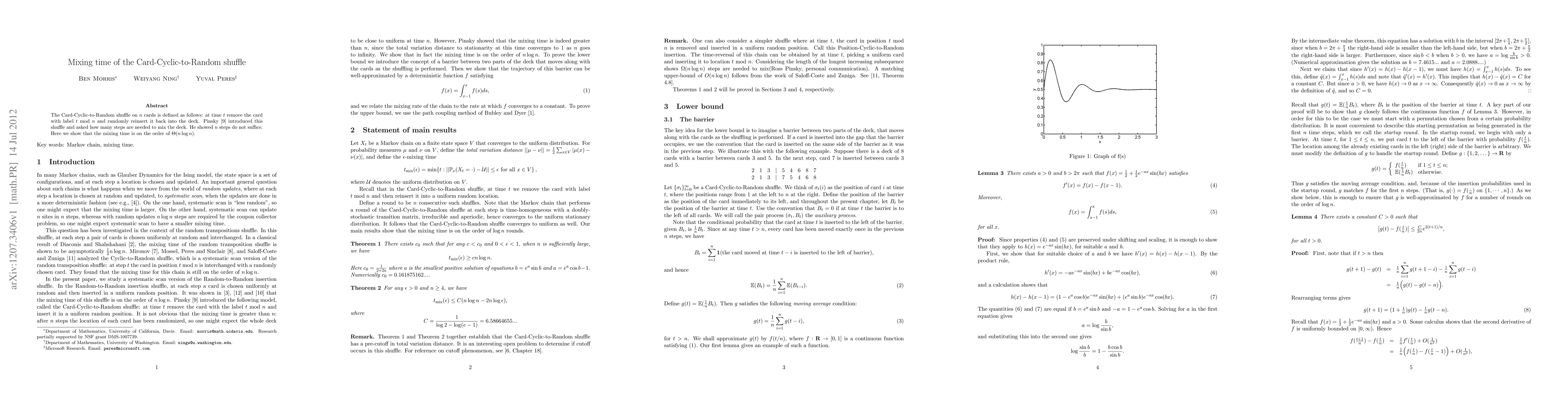 The Card-Cyclic-to-Random shuffle on $n$ cards is defined as follows: at time $t$ remove the card with label $t$ mod $n$ and randomly reinsert it back into the deck. Pinsky introduced this shuffle and asked how many steps are needed to mix the deck. He showed $n$ steps do not suffice. Here we show that the mixing time is on the order of $\Theta(n \log n)$.