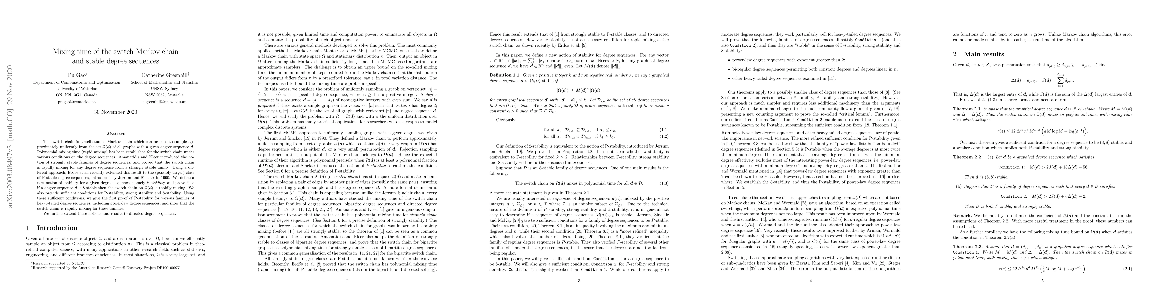 This paper investigates the mixing time of the switch Markov chain used to sample graphs with given degree sequences, proving rapid mixing for degree sequences that are 8-stable. It also provides sufficient conditions for P-stability, strong stability, and 8-stability, and extends these results to directed degree sequences, including power-law degree sequences.