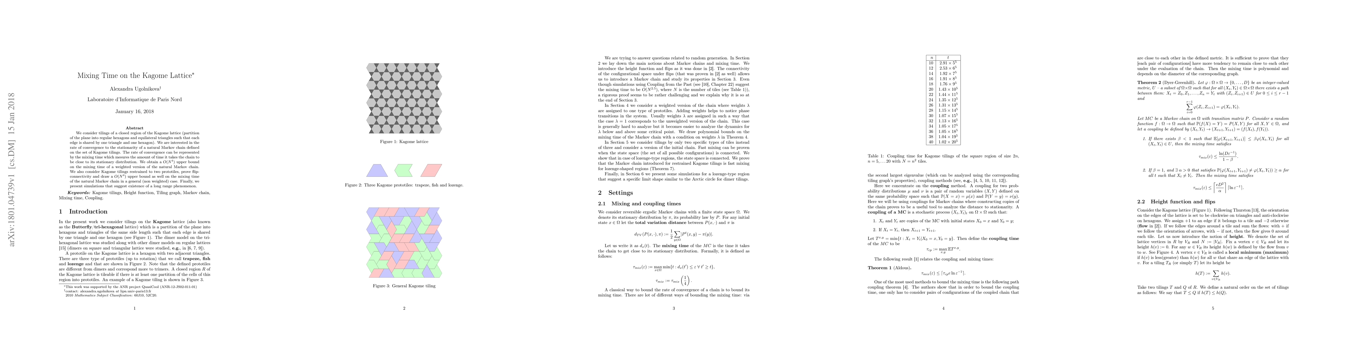 We consider tilings of a closed region of the Kagome lattice (partition of the plane into regular hexagons and equilateral triangles such that each edge is shared by one triangle and one hexagon). We are interested in the rate of convergence to the stationarity of a natural Markov chain defined on the set of Kagome tilings. The rate of convergence can be represented by the mixing time which mesures the amount of time it takes the chain to be close to its stationary distribution. We obtain a $\mathcal{O}(N^4)$ upper bound on the mixing time of a weighted version of the natural Markov chain. We also consider Kagome tilings restrained to two prototiles, prove flip-connectivity and draw a $\mathcal{O}(N^4)$ upper bound as well on the mixing time of the natural Markov chain in a general (non weighted) case. Finally, we present simulations that suggest existence of a long range phenomenon.