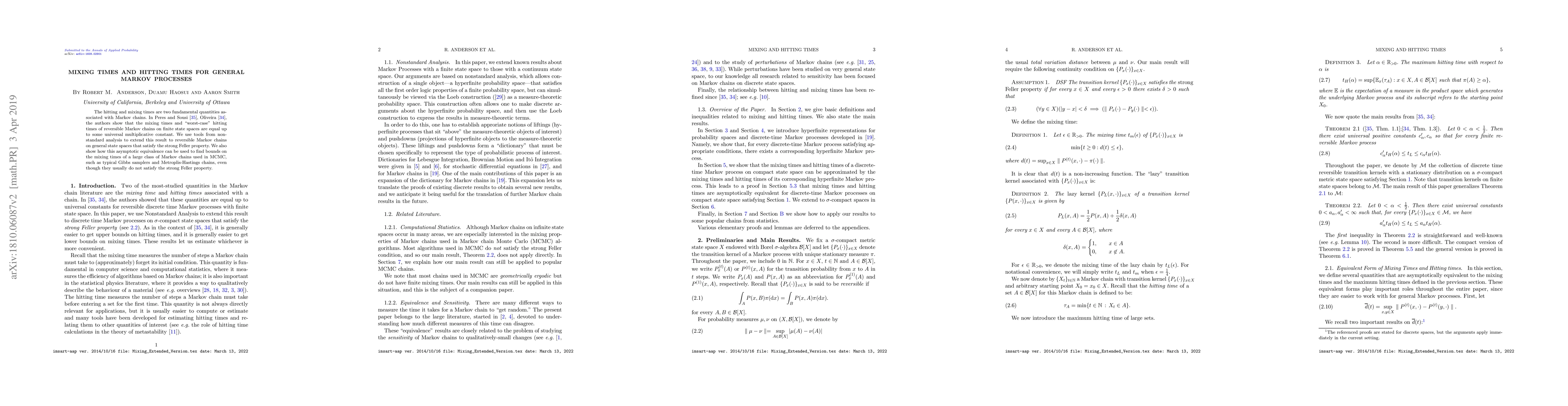 This paper extends results on the equivalence of mixing times and hitting times for reversible Markov chains, originally shown for finite state spaces, to general state spaces using nonstandard analysis. It also provides bounds for mixing times in Markov chains used in MCMC, despite the lack of the strong Feller property.