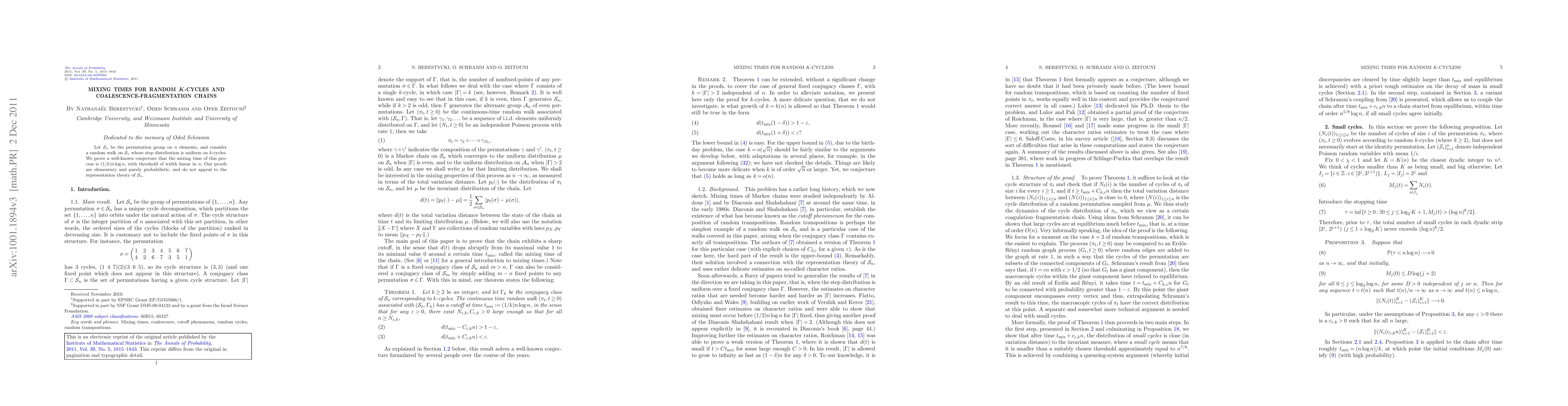 Let $\mathcal{S}_n$ be the permutation group on $n$ elements, and consider a random walk on $\mathcal{S}_n$ whose step distribution is uniform on $k$-cycles. We prove a well-known conjecture that the mixing time of this process is $(1/k)n\log n$, with threshold of width linear in $n$. Our proofs are elementary and purely probabilistic, and do not appeal to the representation theory of $\mathcal{S}_n$.