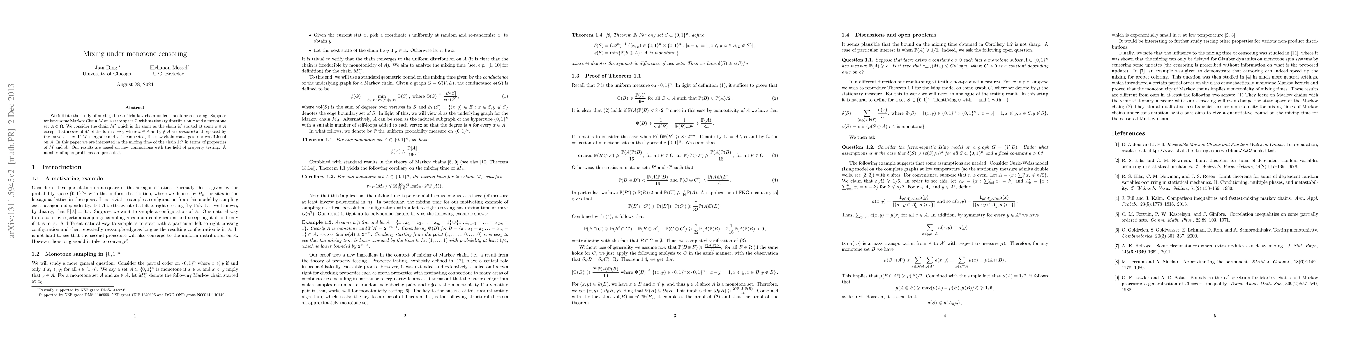We initiate the study of mixing times of Markov chain under monotone censoring. Suppose we have some Markov Chain $M$ on a state space $\Omega$ with stationary distribution $\pi$ and a monotone set $A \subset \Omega$. We consider the chain $M'$ which is the same as the chain $M$ started at some $x \in A$ except that moves of $M$ of the form $x \to y$ where $x \in A$ and $y \notin A$ are {\em censored} and replaced by the move $x \to x$. If $M$ is ergodic and $A$ is connected, the new chain converges to $\pi$ conditional on $A$. In this paper we are interested in the mixing time of the chain $M'$ in terms of properties of $M$ and $A$. Our results are based on new connections with the field of property testing. A number of open problems are presented.