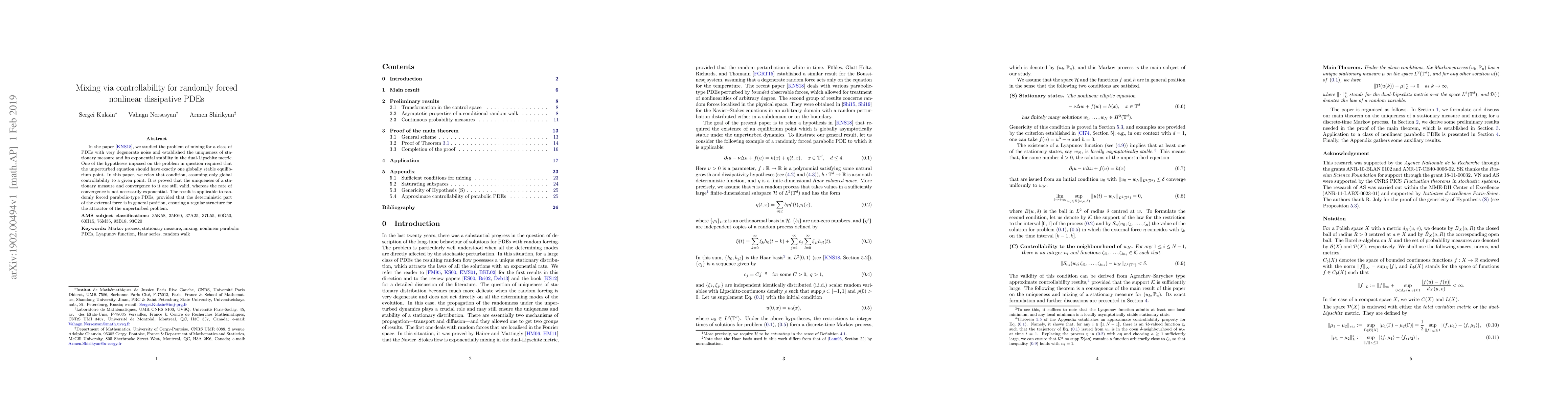 This paper investigates mixing in randomly forced nonlinear dissipative PDEs under relaxed conditions, proving the uniqueness of a stationary measure and its convergence, albeit at a potentially non-exponential rate. The key idea leverages global controllability and a new method linking stability to a conditional random walk.
