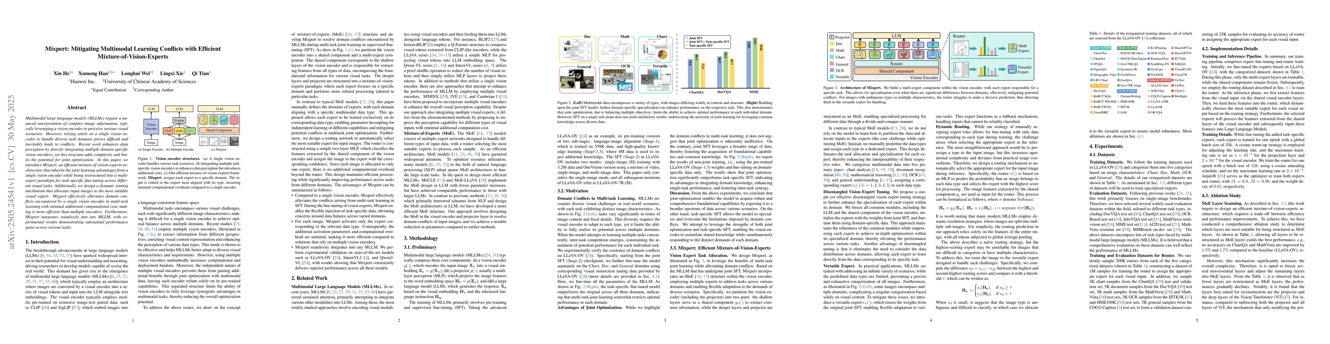 The paper introduces Mixpert, a mixture-of-vision-experts architecture that efficiently handles diverse visual tasks by restructuring a single vision encoder into a multi-expert paradigm. It features a dynamic routing mechanism to allocate input images to the most suitable visual expert, mitigating domain conflicts in multi-task learning with minimal additional computational cost.