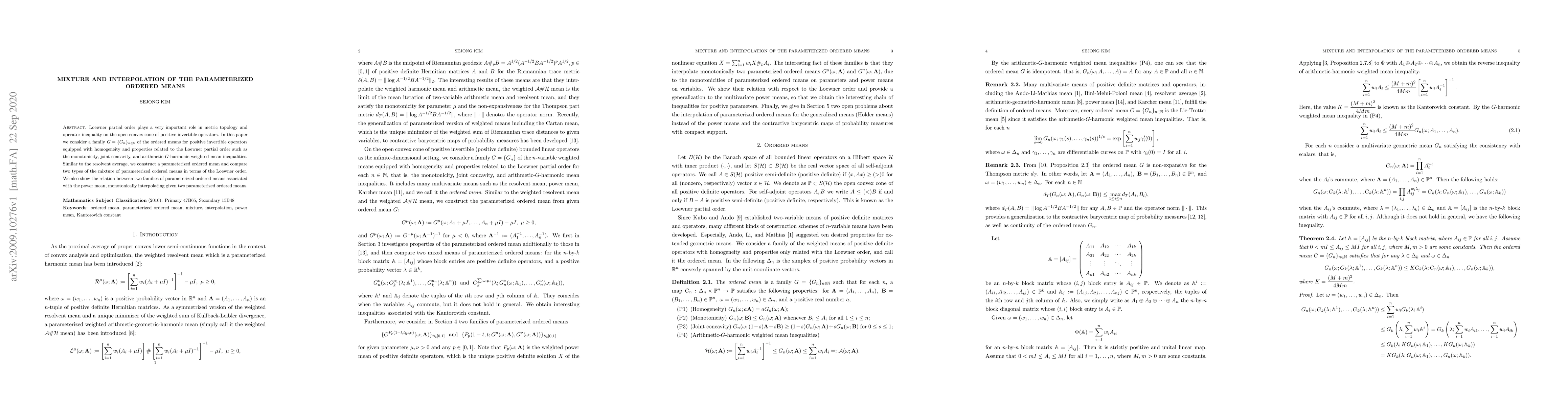 Loewner partial order plays a very important role in metric topology and operator inequality on the open convex cone of positive invertible operators. In this paper we consider a family G of the ordered means for positive invertible operators equipped with homogeneity and properties related to the Loewner partial order such as the monotonicity, joint concavity, and arithmetic-G-harmonic weighted mean inequalities. Similar to the resolvent average, we construct a parameterized ordered mean and compare two types of the mixture of parameterized ordered means in terms of the Loewner order. We also show the relation between two families of parameterized ordered means associated with the power mean, monotonically interpolating given two parameterized ordered means.