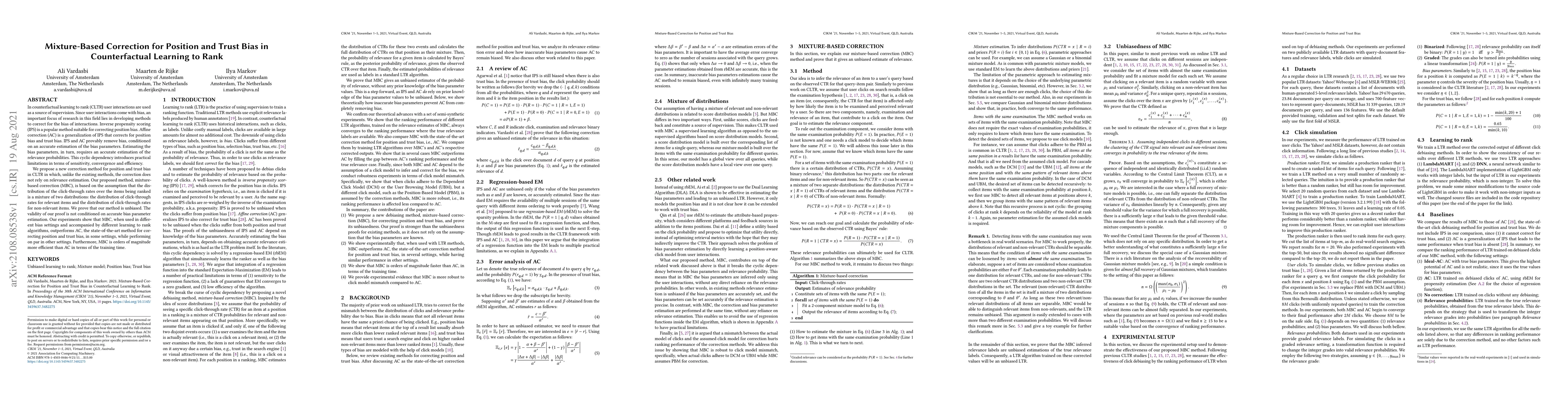 In counterfactual learning to rank (CLTR) user interactions are used as a source of supervision. Since user interactions come with bias, an important focus of research in this field lies in developing methods to correct for the bias of interactions. Inverse propensity scoring (IPS) is a popular method suitable for correcting position bias. Affine correction (AC) is a generalization of IPS that corrects for position bias and trust bias. IPS and AC provably remove bias, conditioned on an accurate estimation of the bias parameters. Estimating the bias parameters, in turn, requires an accurate estimation of the relevance probabilities. This cyclic dependency introduces practical limitations in terms of sensitivity, convergence and efficiency. We propose a new correction method for position and trust bias in CLTR in which, unlike the existing methods, the correction does not rely on relevance estimation. Our proposed method, mixture-based correction (MBC), is based on the assumption that the distribution of the CTRs over the items being ranked is a mixture of two distributions: the distribution of CTRs for relevant items and the distribution of CTRs for non-relevant items. We prove that our method is unbiased. The validity of our proof is not conditioned on accurate bias parameter estimation. Our experiments show that MBC, when used in different bias settings and accompanied by different LTR algorithms, outperforms AC, the state-of-the-art method for correcting position and trust bias, in some settings, while performing on par in other settings. Furthermore, MBC is orders of magnitude more efficient than AC in terms of the training time.