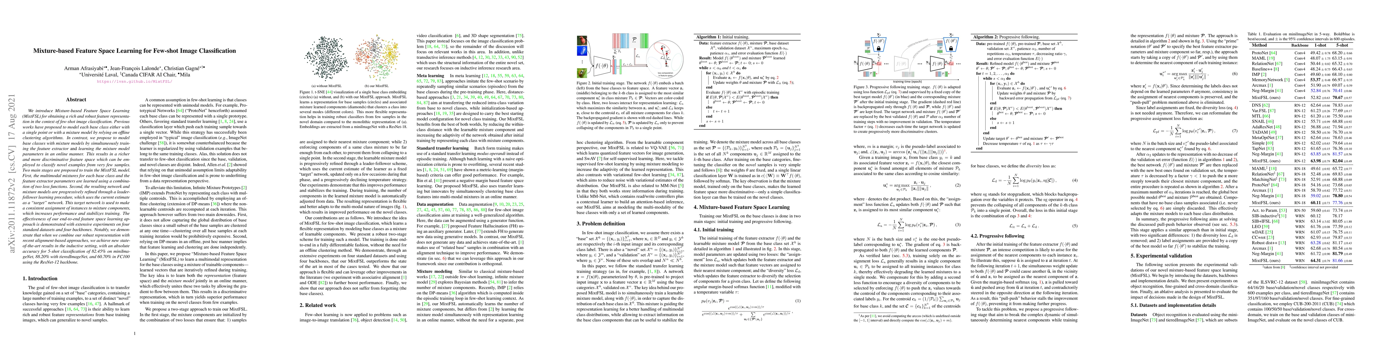 We introduce Mixture-based Feature Space Learning (MixtFSL) for obtaining a rich and robust feature representation in the context of few-shot image classification. Previous works have proposed to model each base class either with a single point or with a mixture model by relying on offline clustering algorithms. In contrast, we propose to model base classes with mixture models by simultaneously training the feature extractor and learning the mixture model parameters in an online manner. This results in a richer and more discriminative feature space which can be employed to classify novel examples from very few samples. Two main stages are proposed to train the MixtFSL model. First, the multimodal mixtures for each base class and the feature extractor parameters are learned using a combination of two loss functions. Second, the resulting network and mixture models are progressively refined through a leader-follower learning procedure, which uses the current estimate as a "target" network. This target network is used to make a consistent assignment of instances to mixture components, which increases performance and stabilizes training. The effectiveness of our end-to-end feature space learning approach is demonstrated with extensive experiments on four standard datasets and four backbones. Notably, we demonstrate that when we combine our robust representation with recent alignment-based approaches, we achieve new state-of-the-art results in the inductive setting, with an absolute accuracy for 5-shot classification of 82.45 on miniImageNet, 88.20 with tieredImageNet, and 60.70 in FC100 using the ResNet-12 backbone.