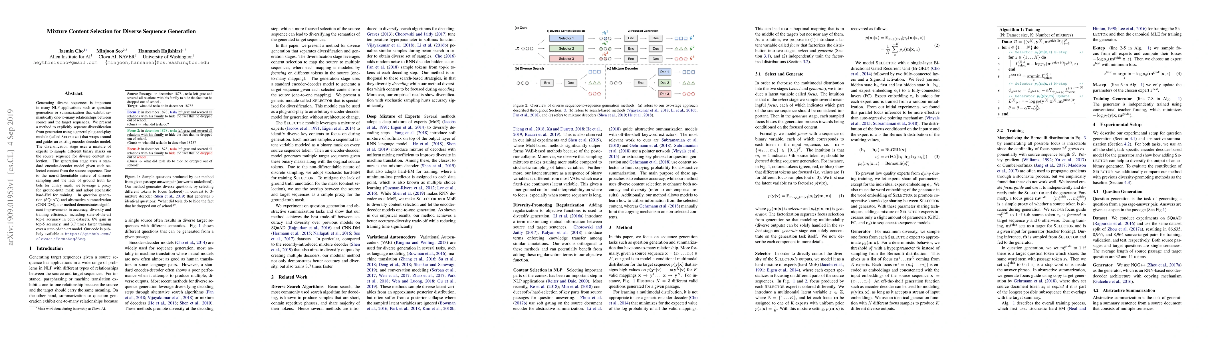 Generating diverse sequences is important in many NLP applications such as question generation or summarization that exhibit semantically one-to-many relationships between source and the target sequences. We present a method to explicitly separate diversification from generation using a general plug-and-play module (called SELECTOR) that wraps around and guides an existing encoder-decoder model. The diversification stage uses a mixture of experts to sample different binary masks on the source sequence for diverse content selection. The generation stage uses a standard encoder-decoder model given each selected content from the source sequence. Due to the non-differentiable nature of discrete sampling and the lack of ground truth labels for binary mask, we leverage a proxy for ground truth mask and adopt stochastic hard-EM for training. In question generation (SQuAD) and abstractive summarization (CNN-DM), our method demonstrates significant improvements in accuracy, diversity and training efficiency, including state-of-the-art top-1 accuracy in both datasets, 6% gain in top-5 accuracy, and 3.7 times faster training over a state of the art model. Our code is publicly available at https://github.com/clovaai/FocusSeq2Seq.