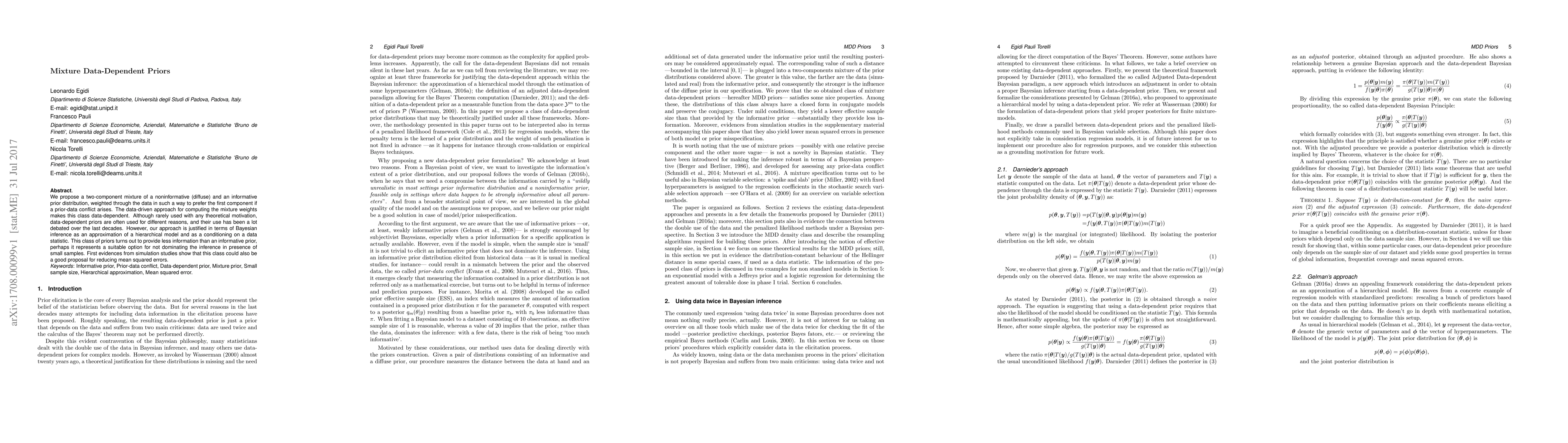 This paper introduces a two-component mixture of noninformative and informative priors, dynamically weighted based on data to mitigate prior-data conflicts. The proposed data-dependent priors, justified through Bayesian inference, aim to balance information and reduce mean squared errors, especially in small sample sizes.