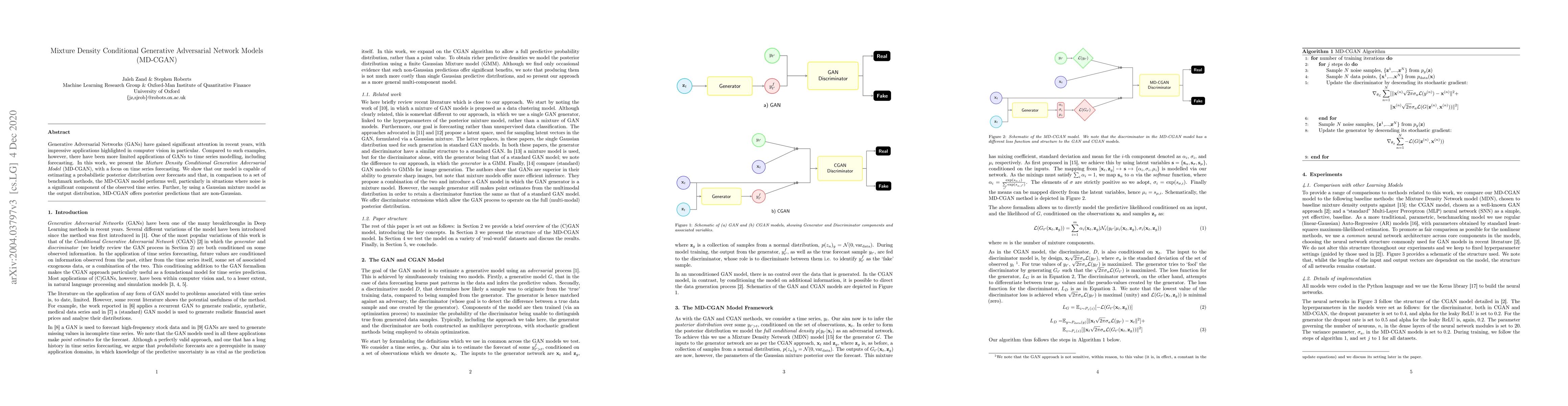 The Mixture Density Conditional Generative Adversarial Network (MD-CGAN) model is presented for time series forecasting, demonstrating superior performance in noisy data scenarios. It leverages a Gaussian mixture model to provide non-Gaussian probabilistic posterior predictions, outperforming benchmark methods.