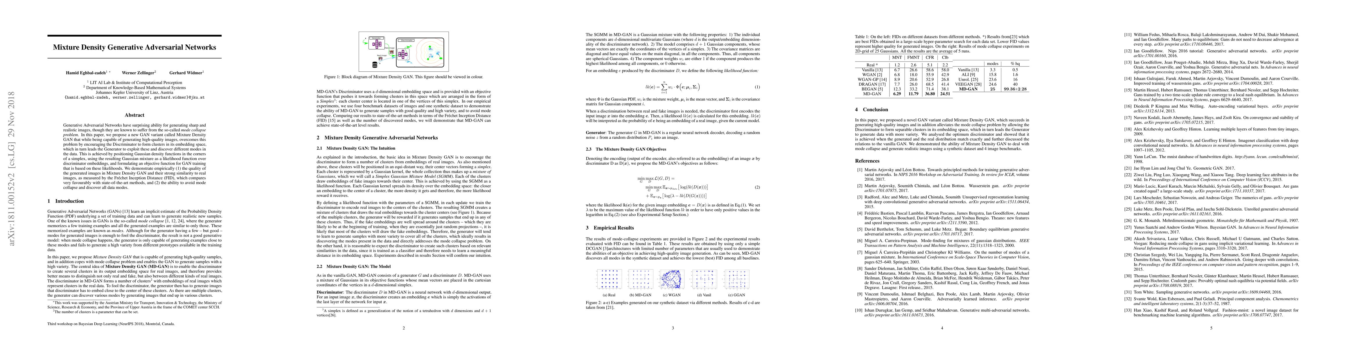 Generative Adversarial Networks have surprising ability for generating sharp and realistic images, though they are known to suffer from the so-called mode collapse problem. In this paper, we propose a new GAN variant called Mixture Density GAN that while being capable of generating high-quality images, overcomes this problem by encouraging the Discriminator to form clusters in its embedding space, which in turn leads the Generator to exploit these and discover different modes in the data. This is achieved by positioning Gaussian density functions in the corners of a simplex, using the resulting Gaussian mixture as a likelihood function over discriminator embeddings, and formulating an objective function for GAN training that is based on these likelihoods. We demonstrate empirically (1) the quality of the generated images in Mixture Density GAN and their strong similarity to real images, as measured by the Fr\'echet Inception Distance (FID), which compares very favourably with state-of-the-art methods, and (2) the ability to avoid mode collapse and discover all data modes.