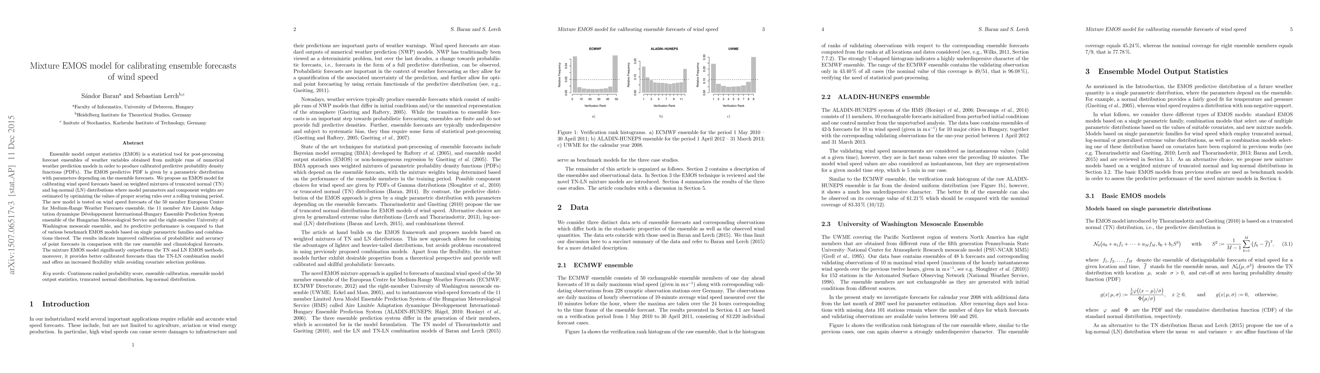 The paper proposes a mixture EMOS model using weighted mixtures of truncated normal and log-normal distributions for calibrating ensemble wind speed forecasts, showing improved calibration and accuracy over single-distribution and combined models. The method is tested on multiple ensemble datasets, demonstrating superior performance.
