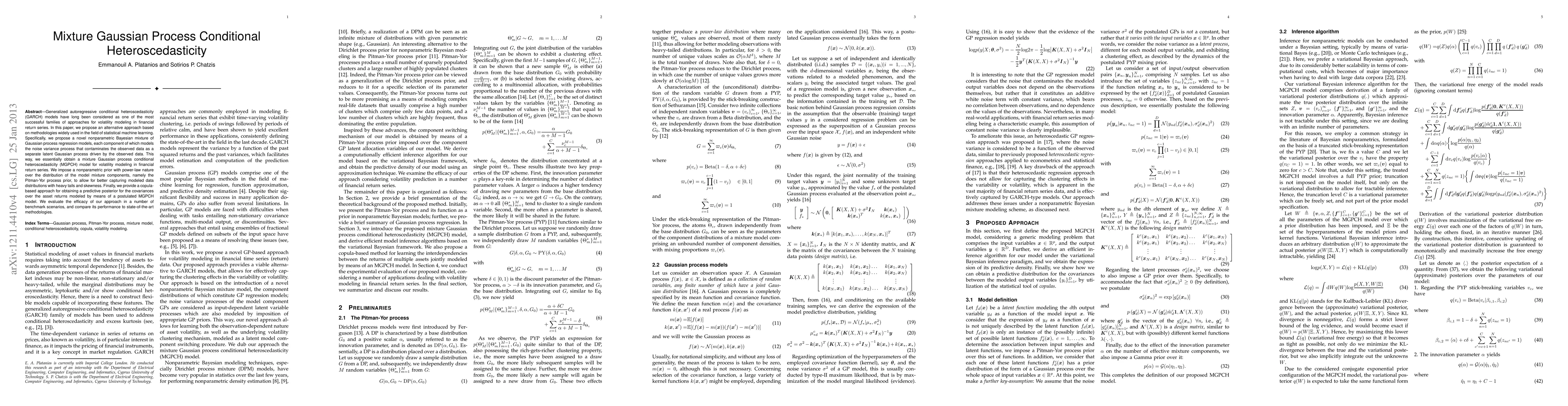 This paper proposes a novel nonparametric Bayesian mixture of Gaussian process regression models for volatility modeling in financial return series. The approach uses a Pitman-Yor process prior to handle heavy-tailed and skewed data distributions, and a copula-based method for predictive posterior covariances, demonstrating competitive performance against state-of-the-art methods.
