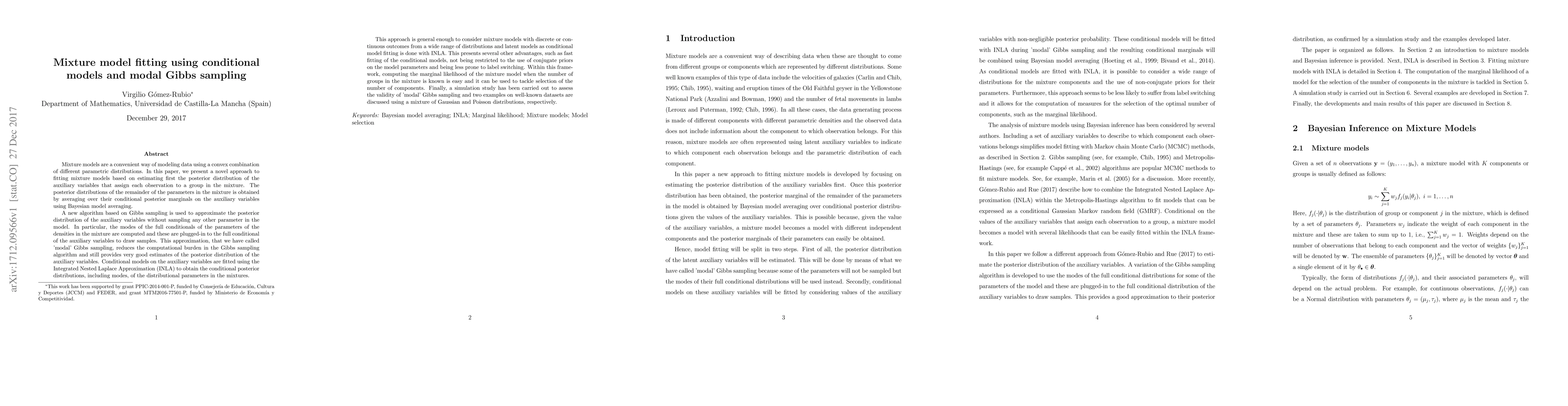 This paper introduces a novel mixture model fitting method using conditional models and a new 'modal' Gibbs sampling approach. It estimates the posterior distribution of auxiliary variables first, then computes conditional posterior marginals for mixture parameters, reducing computational burden and improving estimation accuracy.