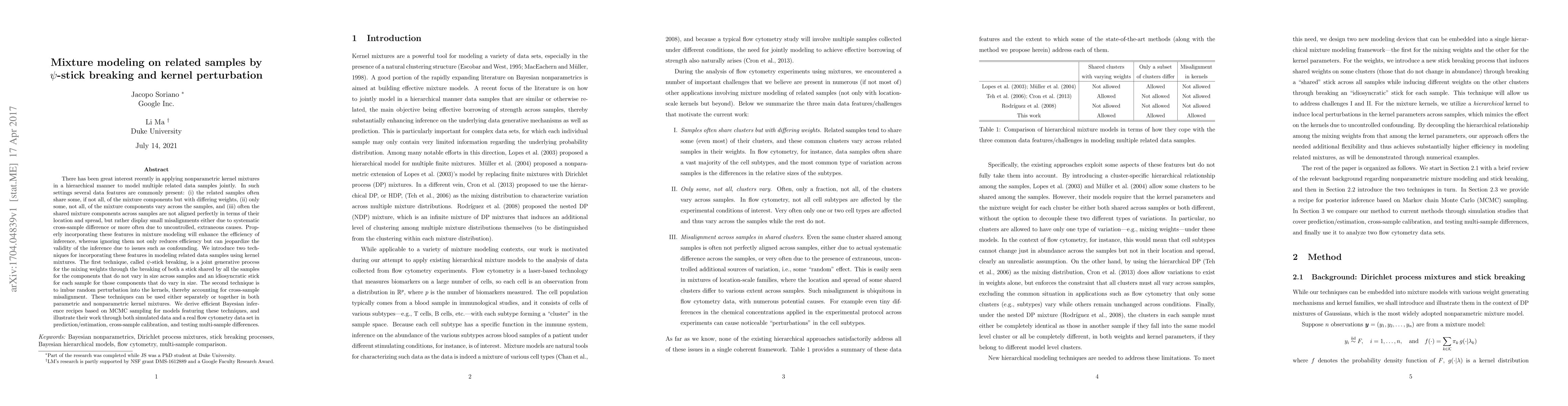 There has been great interest recently in applying nonparametric kernel mixtures in a hierarchical manner to model multiple related data samples jointly. In such settings several data features are commonly present: (i) the related samples often share some, if not all, of the mixture components but with differing weights, (ii) only some, not all, of the mixture components vary across the samples, and (iii) often the shared mixture components across samples are not aligned perfectly in terms of their location and spread, but rather display small misalignments either due to systematic cross-sample difference or more often due to uncontrolled, extraneous causes. Properly incorporating these features in mixture modeling will enhance the efficiency of inference, whereas ignoring them not only reduces efficiency but can jeopardize the validity of the inference due to issues such as confounding. We introduce two techniques for incorporating these features in modeling related data samples using kernel mixtures. The first technique, called $\psi$-stick breaking, is a joint generative process for the mixing weights through the breaking of both a stick shared by all the samples for the components that do not vary in size across samples and an idiosyncratic stick for each sample for those components that do vary in size. The second technique is to imbue random perturbation into the kernels, thereby accounting for cross-sample misalignment. These techniques can be used either separately or together in both parametric and nonparametric kernel mixtures. We derive efficient Bayesian inference recipes based on MCMC sampling for models featuring these techniques, and illustrate their work through both simulated data and a real flow cytometry data set in prediction/estimation, cross-sample calibration, and testing multi-sample differences.