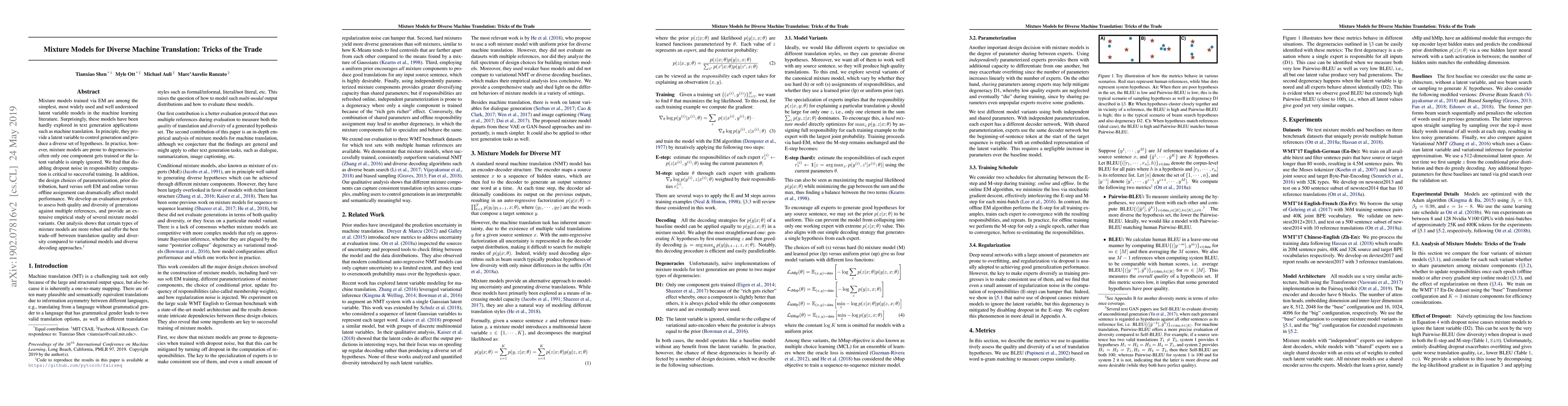 Mixture models trained via EM are among the simplest, most widely used and well understood latent variable models in the machine learning literature. Surprisingly, these models have been hardly explored in text generation applications such as machine translation. In principle, they provide a latent variable to control generation and produce a diverse set of hypotheses. In practice, however, mixture models are prone to degeneracies---often only one component gets trained or the latent variable is simply ignored. We find that disabling dropout noise in responsibility computation is critical to successful training. In addition, the design choices of parameterization, prior distribution, hard versus soft EM and online versus offline assignment can dramatically affect model performance. We develop an evaluation protocol to assess both quality and diversity of generations against multiple references, and provide an extensive empirical study of several mixture model variants. Our analysis shows that certain types of mixture models are more robust and offer the best trade-off between translation quality and diversity compared to variational models and diverse decoding approaches.\footnote{Code to reproduce the results in this paper is available at \url{https://github.com/pytorch/fairseq}}