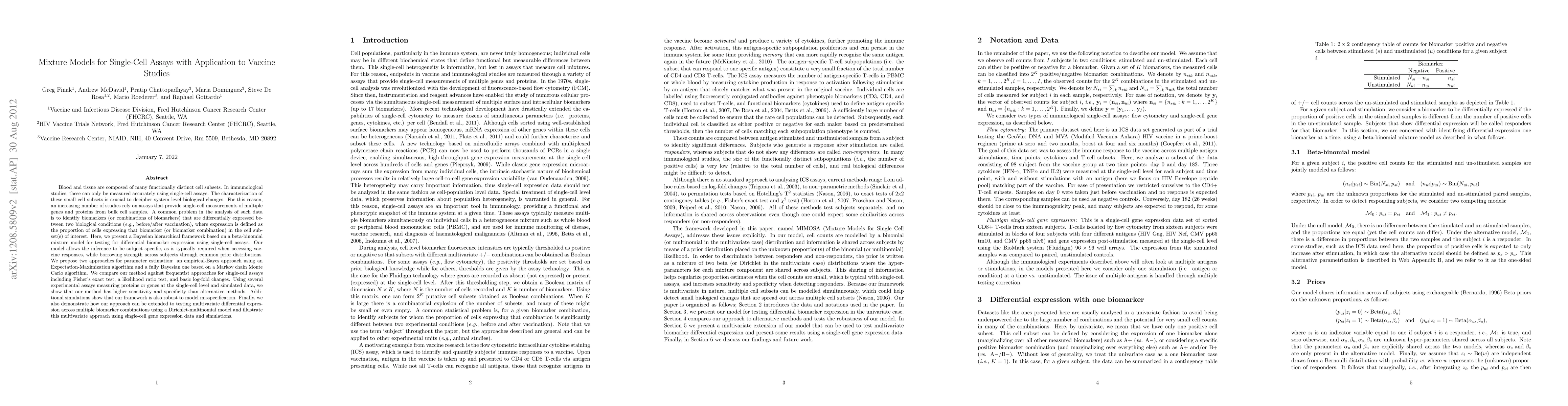 This paper introduces a Bayesian hierarchical beta-binomial mixture model for analyzing single-cell assays to identify differentially expressed biomarkers in vaccine studies. The proposed method, compared to frequentist approaches, shows higher sensitivity and specificity, and is robust to model misspecification.